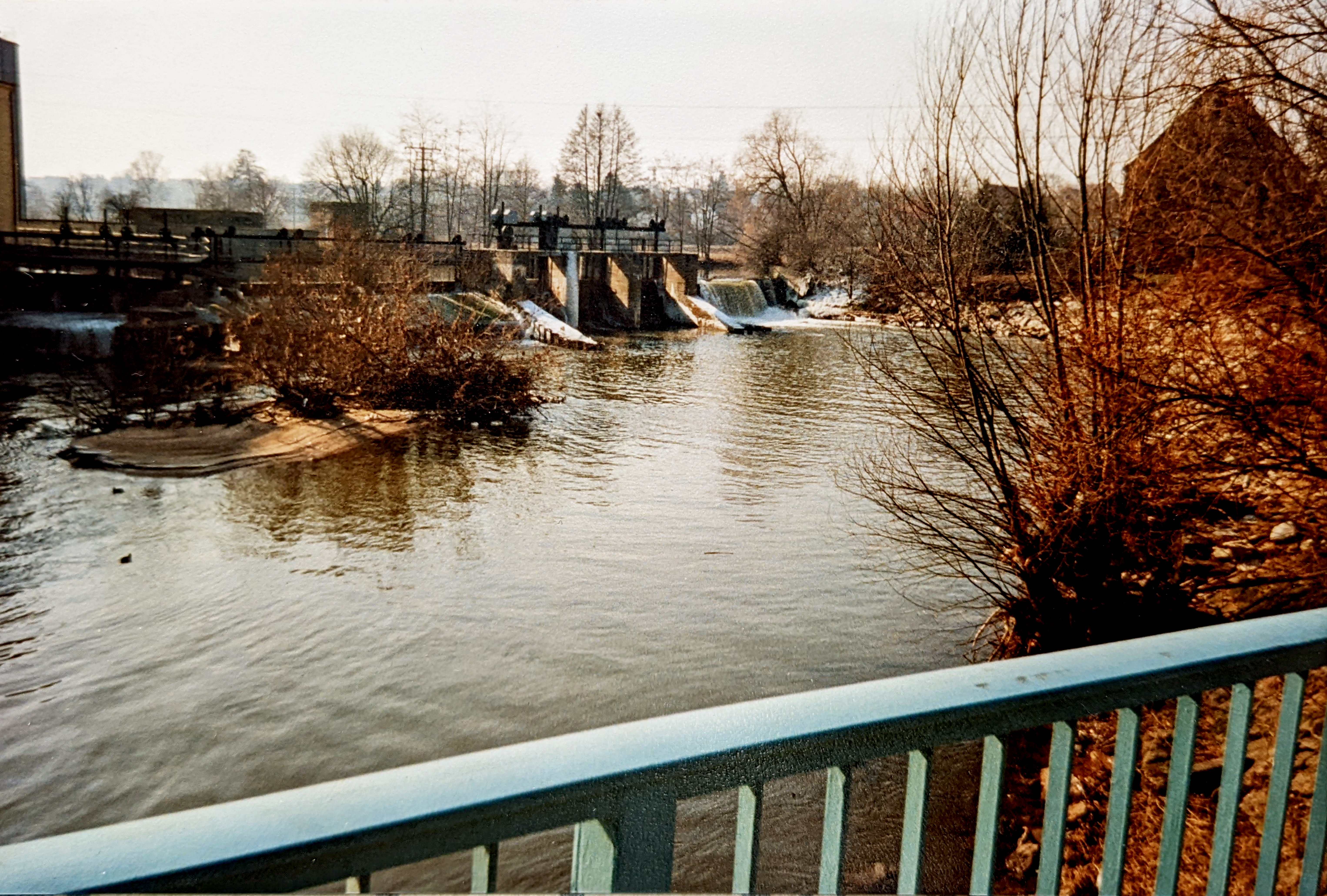 | Beschreibung | Blick von der Vacher Regnitzbrücke mit dem Wehr an der Kunstmühle Vach, im Hintergrund Vach Feb. 1994 | ||
