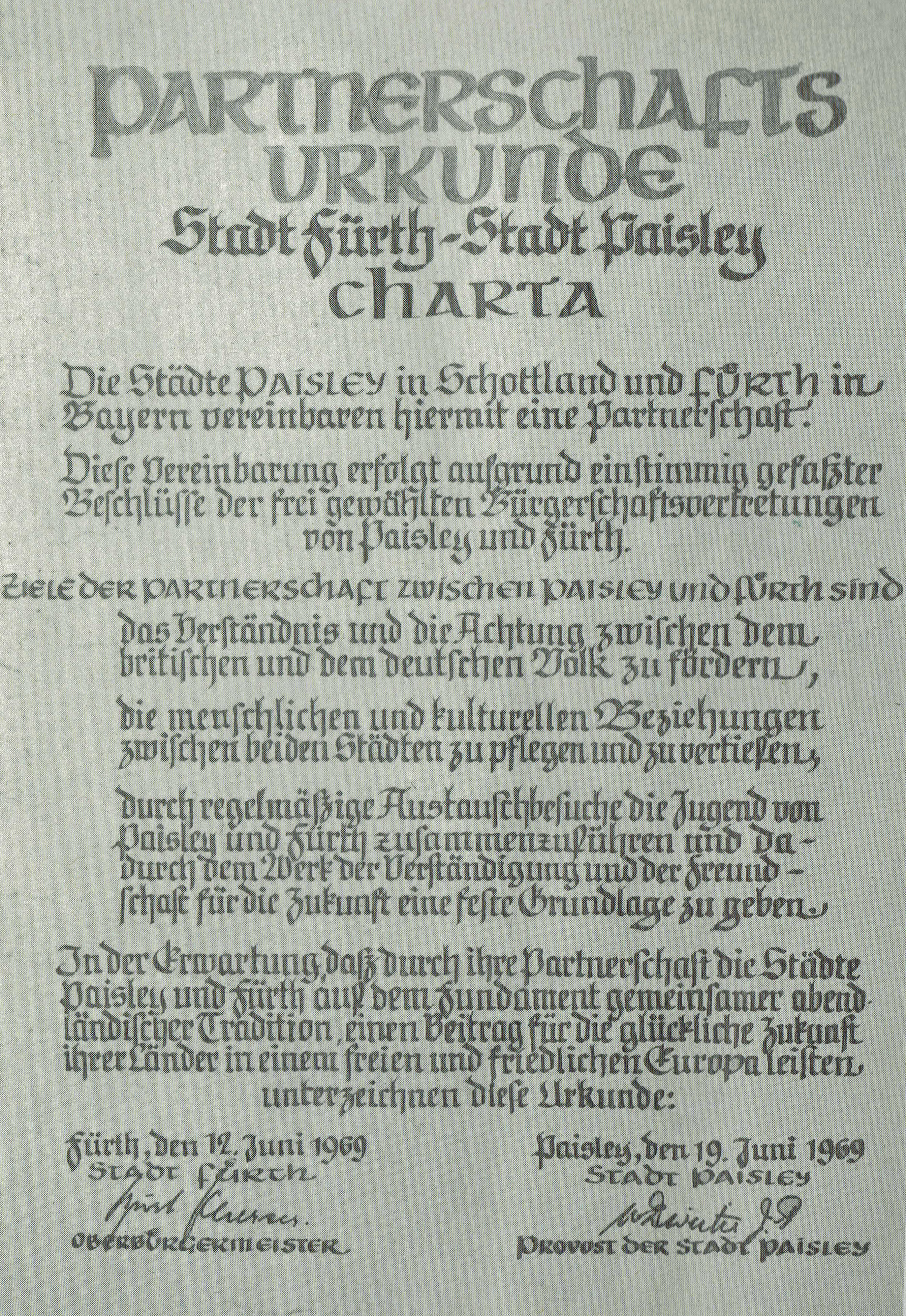 | Beschreibung | Partnerschaftsurkunde Stadt Fürth - Stadt Paisley, Abdruck im Amtblatt Nr. 34 vom 14. Oktober 1994 anlässlich des 25-jährigen Jubiläums | ||