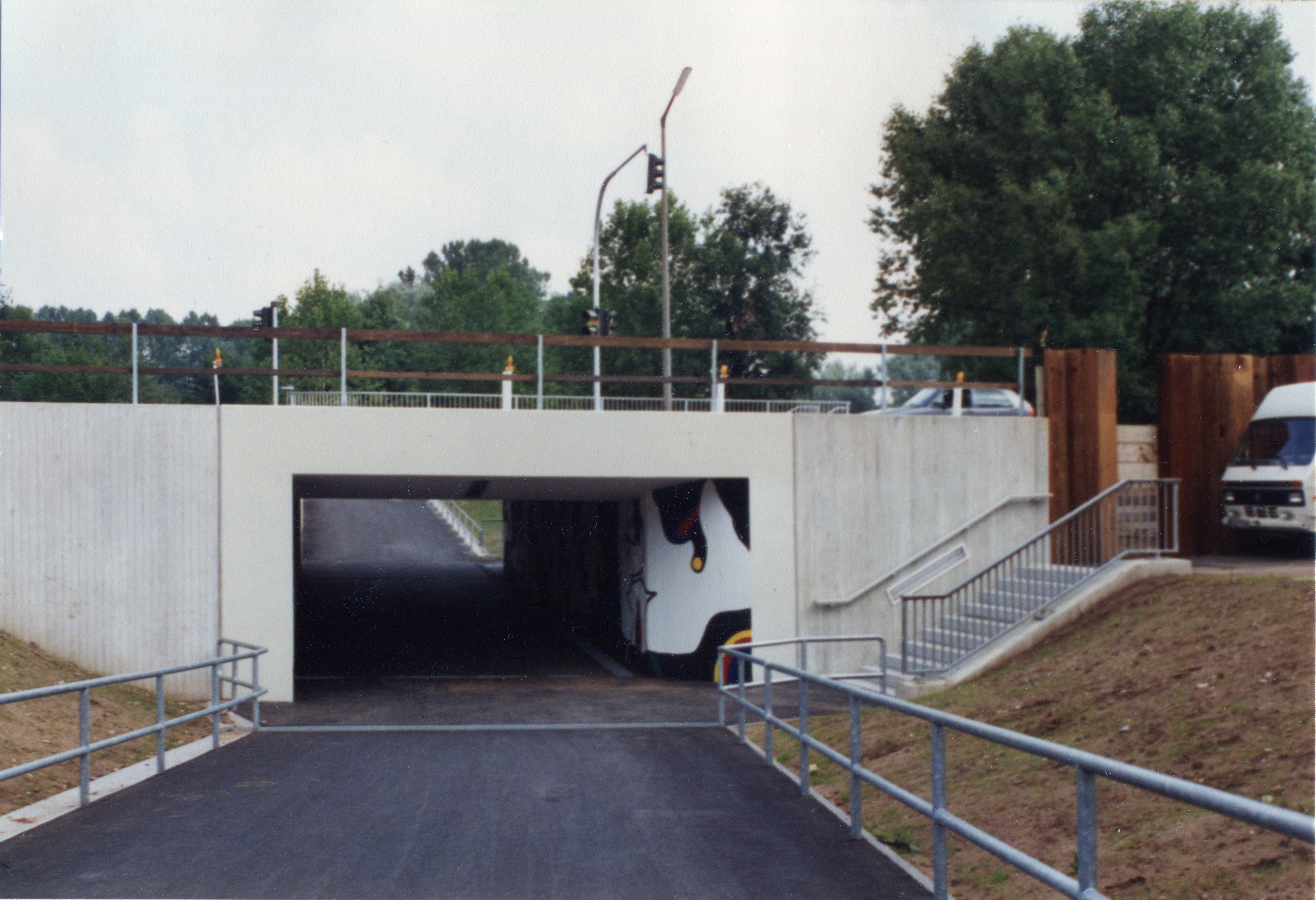 | Beschreibung | Die Unterführung Schießplatz unter der Kapellenstraße vom Schießplatz aus kurz nach ihrer Eröffnung. Im Hintergrund der Schießanger, Aug. 1996 | ||