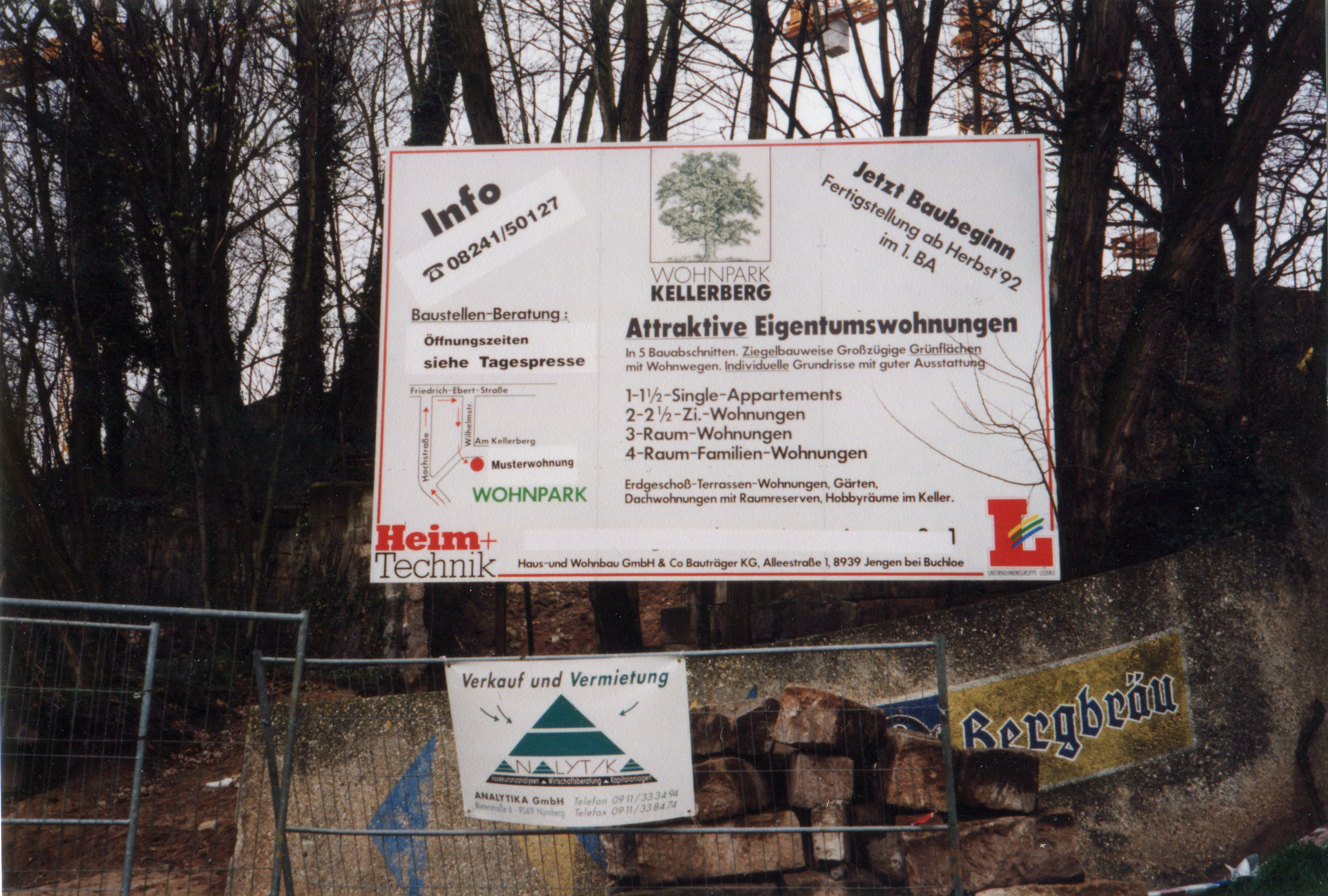 | Beschreibung | Aufnahme der Bautafel am ehem. Bergbräu-Gelände für die Wohnanlage Am Kellerberg - im Hintergrund noch die alte Werbung der Brauerei Mailaender, 1990 | ||