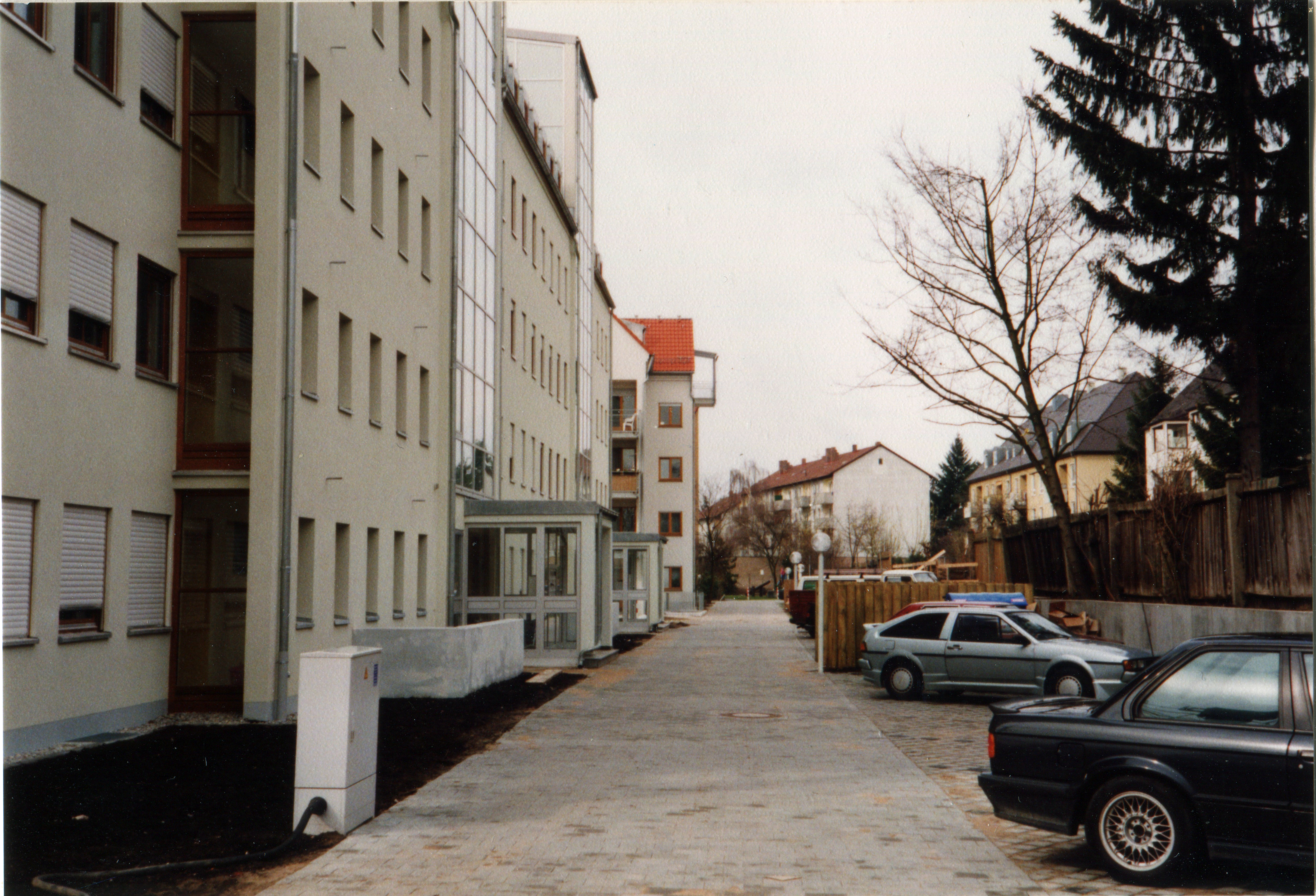 BeschreibungAufnahme auf dem ehem. Bergbräu-Gelände, hier Wohnbebauung Am Kellerberg 12, 11, 7 - im Hintergrund das Gebäude Nottelbergstraße 10, März 1994