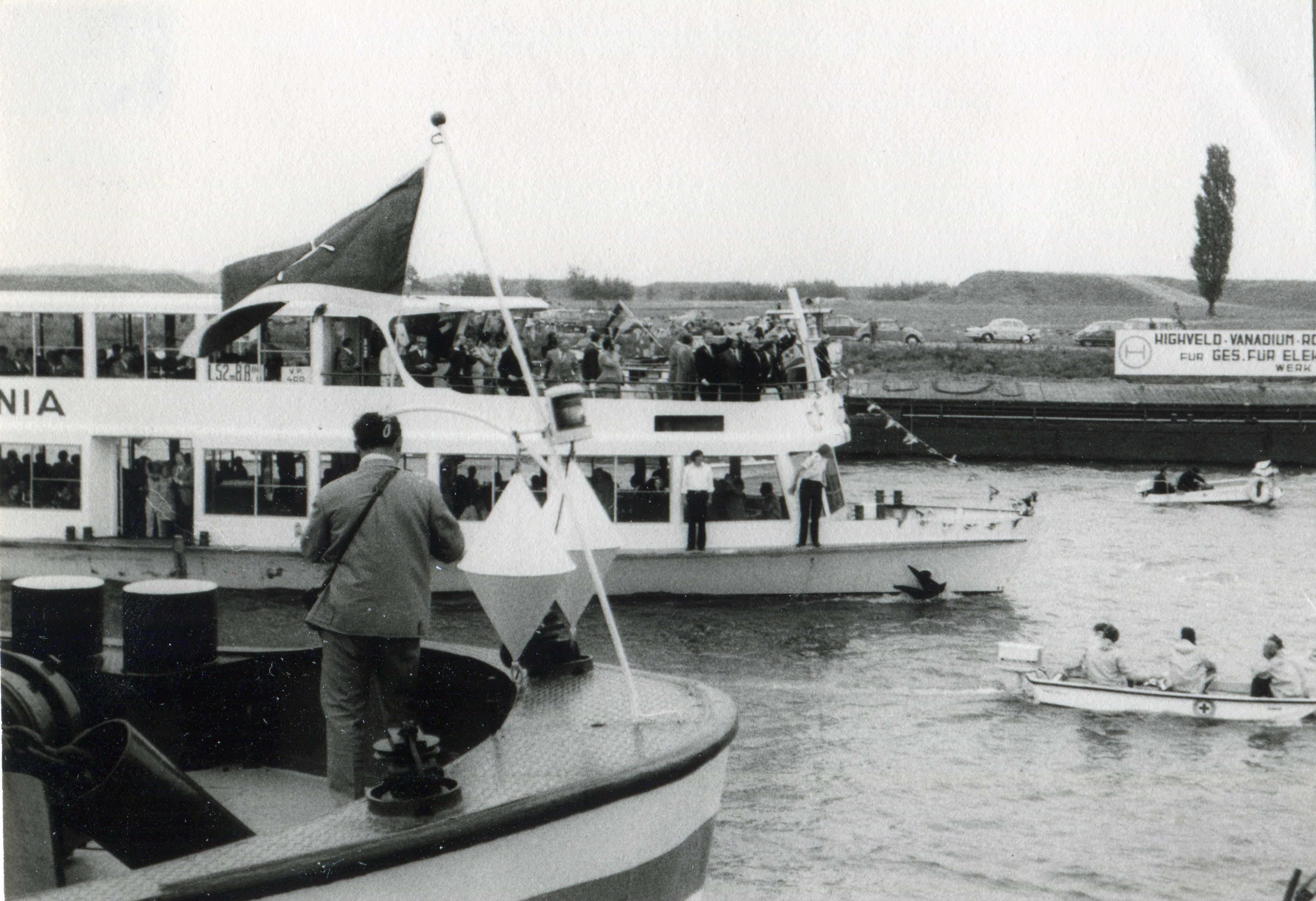 BeschreibungOB Kurt Scherzer und BM Heinrich Stranka (mit Amtskette) auf dem Schiff Franconia zur Eröffnungsfeier des Fürther Hafens am 15. Juli 1972