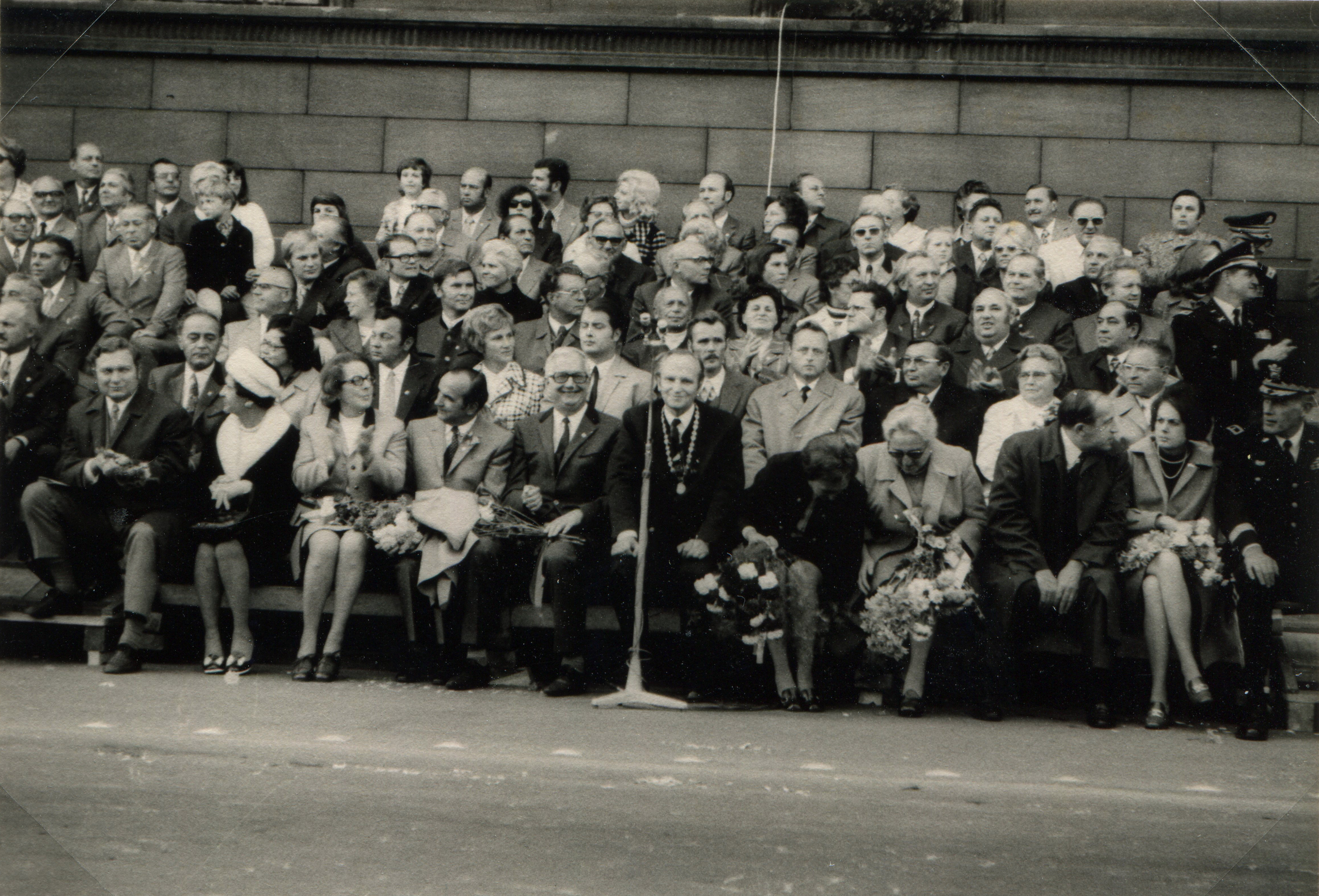 | Beschreibung | Gästetribüne am Erntedankumzug zur Michelis-Kirchweih im Oktober 1972 mit OB Scherzer | ||
