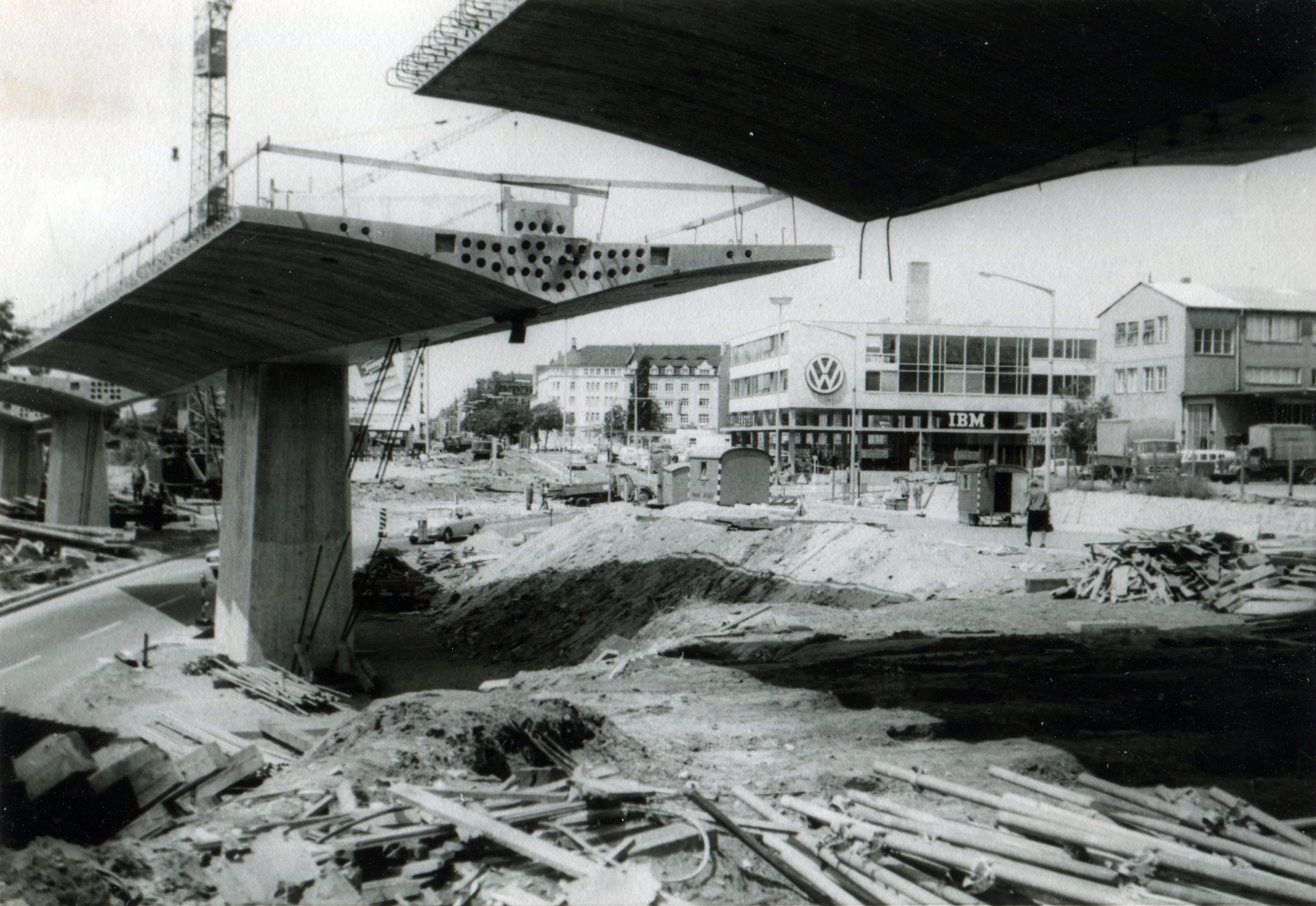 | Beschreibung | Bau der späteren U-Bahnbrücke an der Stadtgrenze, im Hintergrund das Autohaus Pillenstein, Juli 1968 | ||