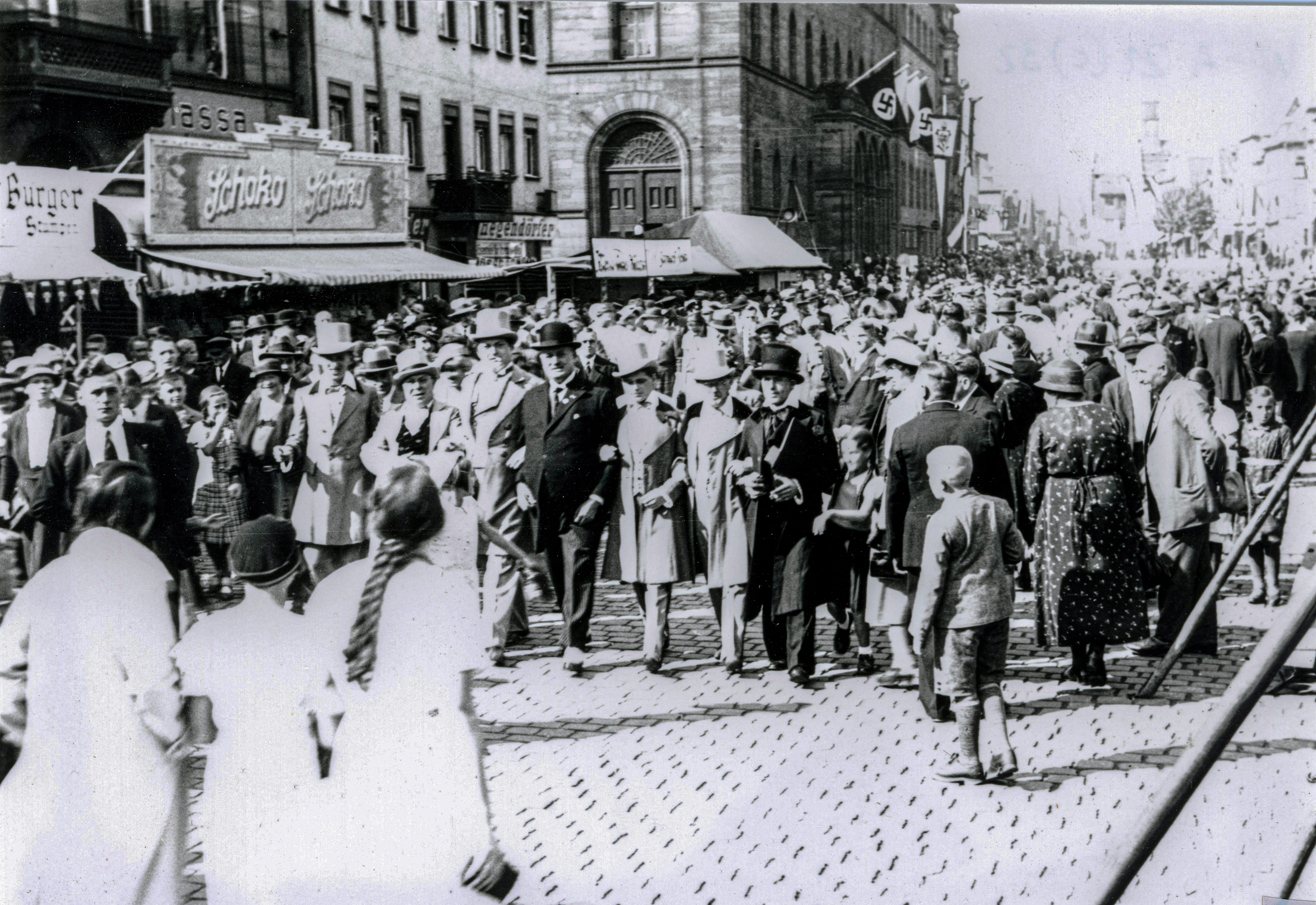 | Beschreibung | Die Michaelis-Kirchweih in der Königstraße - in der Bildmitte der Schausspieler Fritz Bernet, 1934 | ||