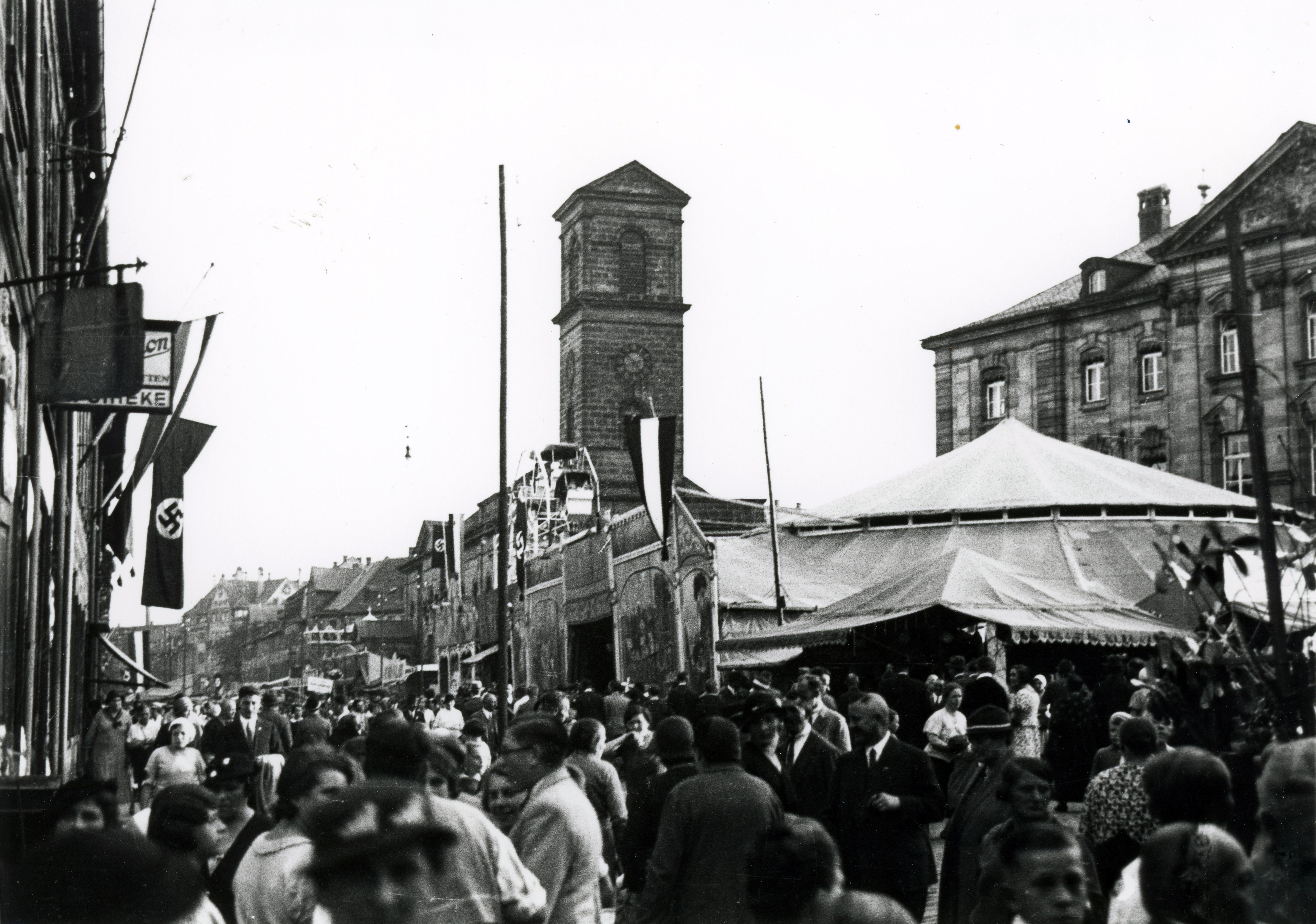 | Beschreibung | Michaelis-Kirchweih mit Fahrgeschäften auf der Helmplatz - im Hintergrund die Kirche „Zu Unserer Lieben Frau“, 1937 | ||
