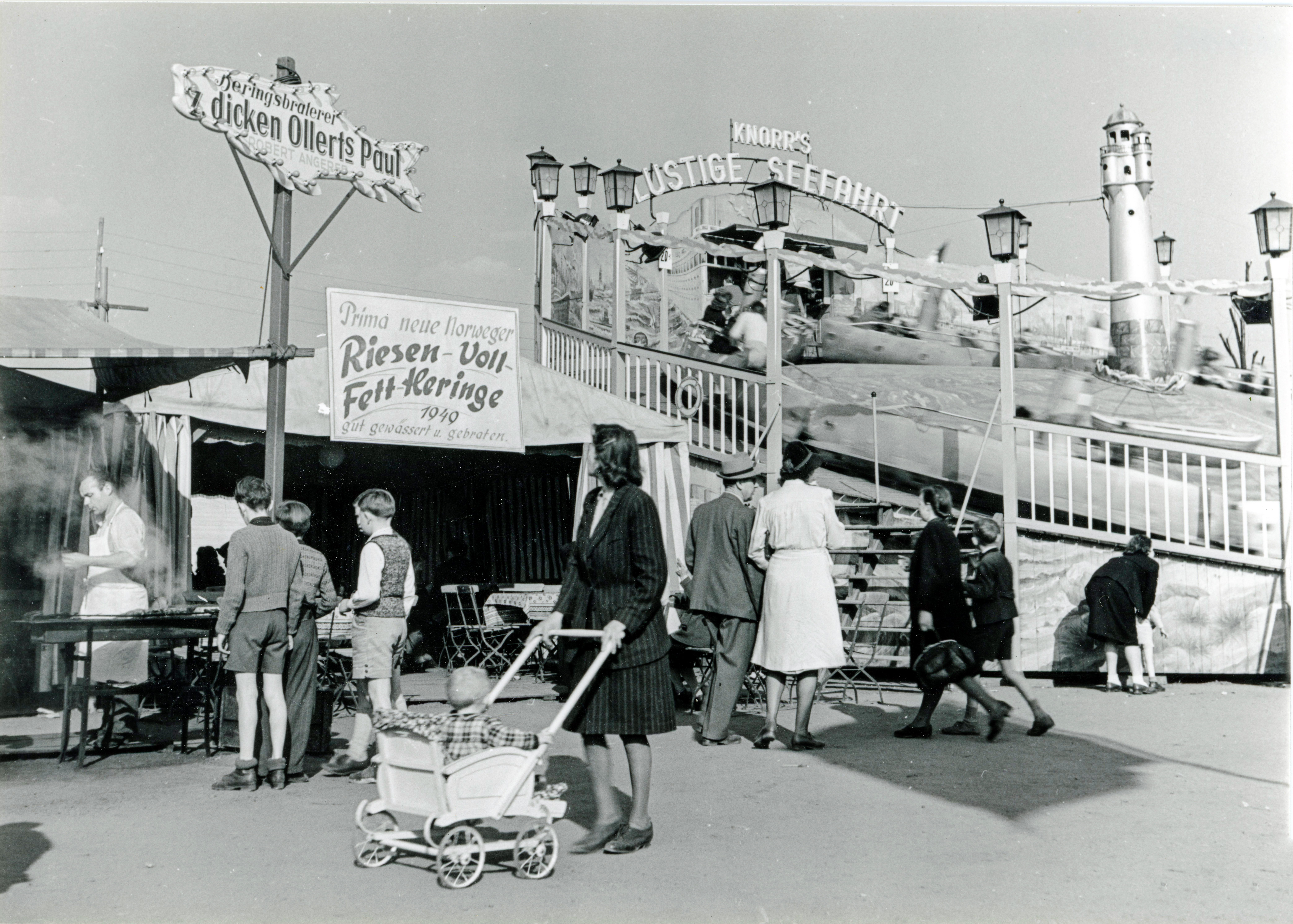 | Beschreibung | Michaelis-Kirchweih mit Fahrgeschäften und Heringsbraterei, 1949 | ||