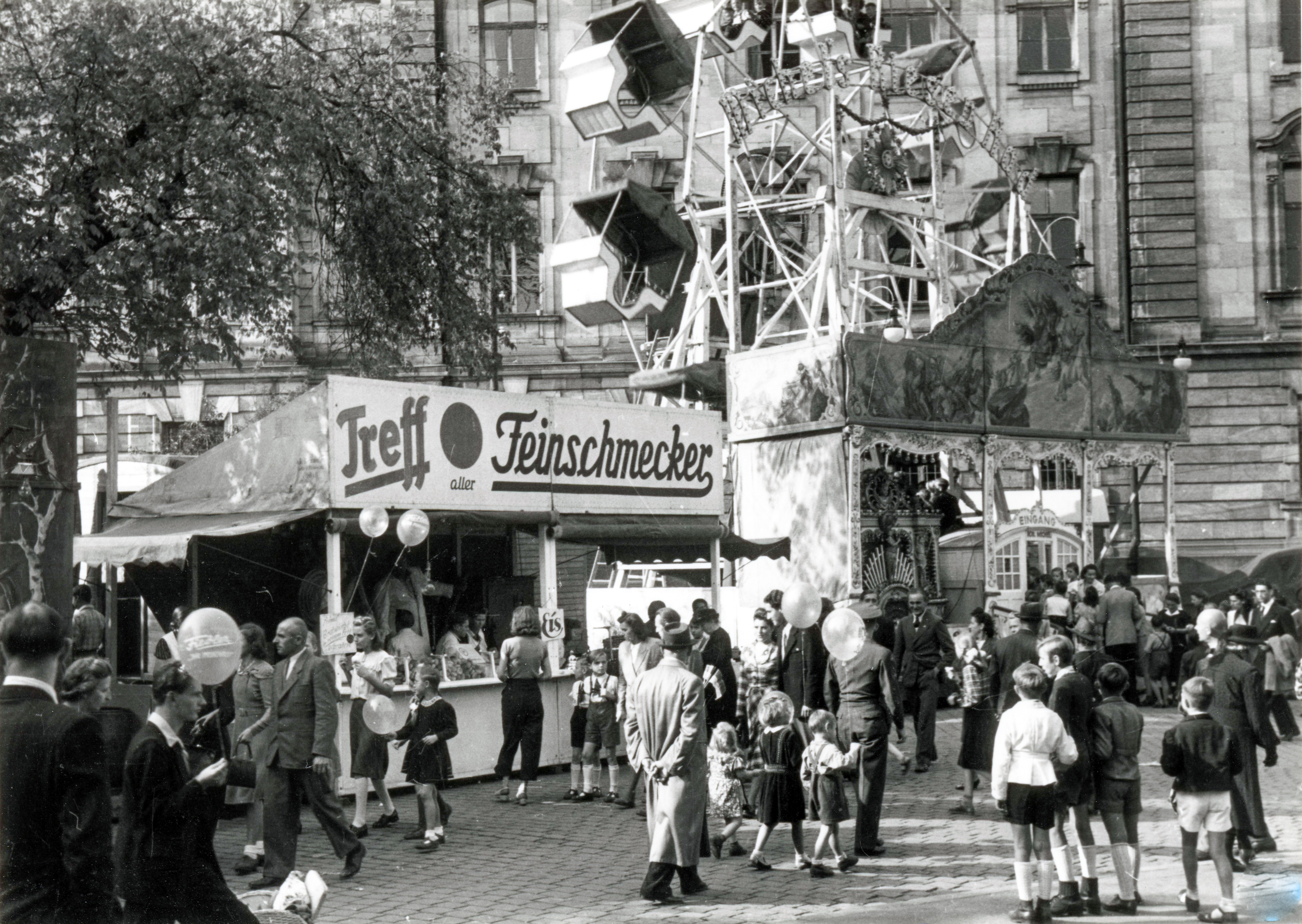 | Beschreibung | Michaelis-Kirchweih auf dem Hallplatz - im Hintergrund das Amtsgericht, 1949 | ||