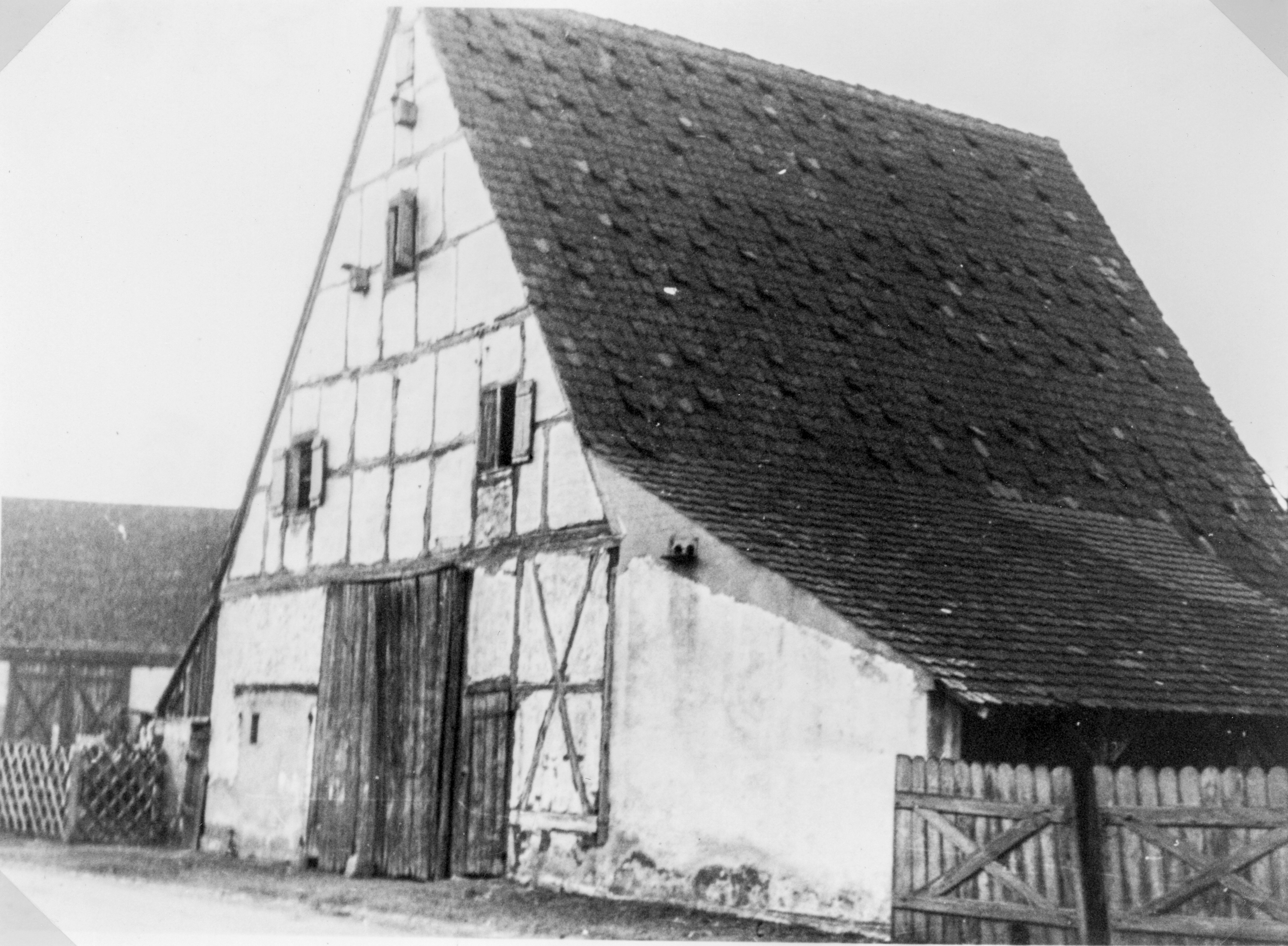| Beschreibung | Der Schneiders-Stadel im Jahr 1943. Besitzer Michael Roth Jetzinger und Familie Wilhelm Jäger, in den 1970er Jahren abgerissen. Heute steht dort ein Mehrfamilien-Wohnblock. Dahinter die 1972 abgerissene Scheune von Thomas Kleinlein. | ||