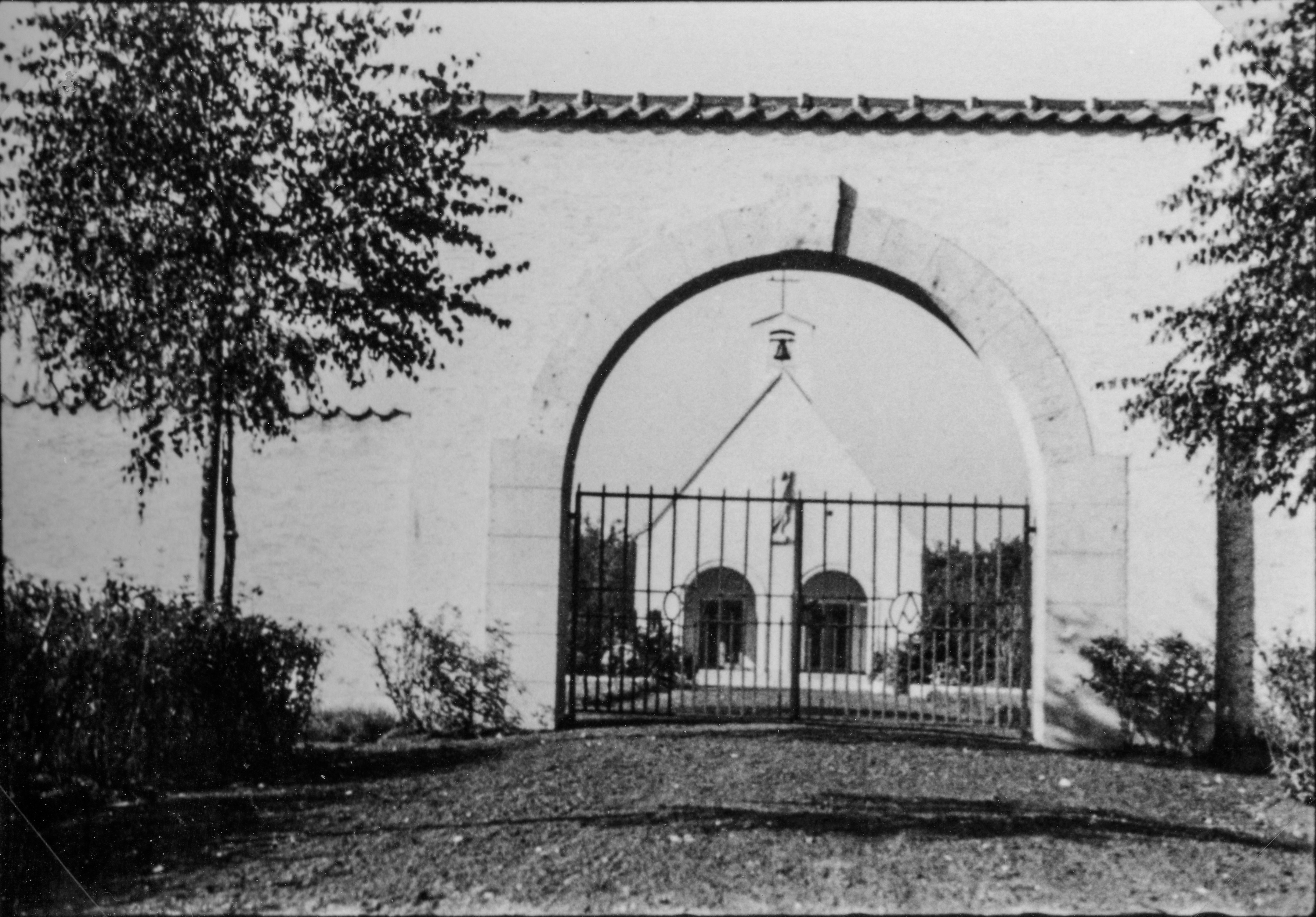 | Beschreibung | Haupteingang zum Friedhof Stadeln mit dem 1972 demontierten Torbogen. Dahinter die im gleichem Jahr abgerissene erste Aussegnungshalle, heute Grünanlage vor dem neuen Gebäude. Christusfigur an der Fassade, heute deplatziert im WC Gebäude eingebaut, Aufnahme von 1943 | ||