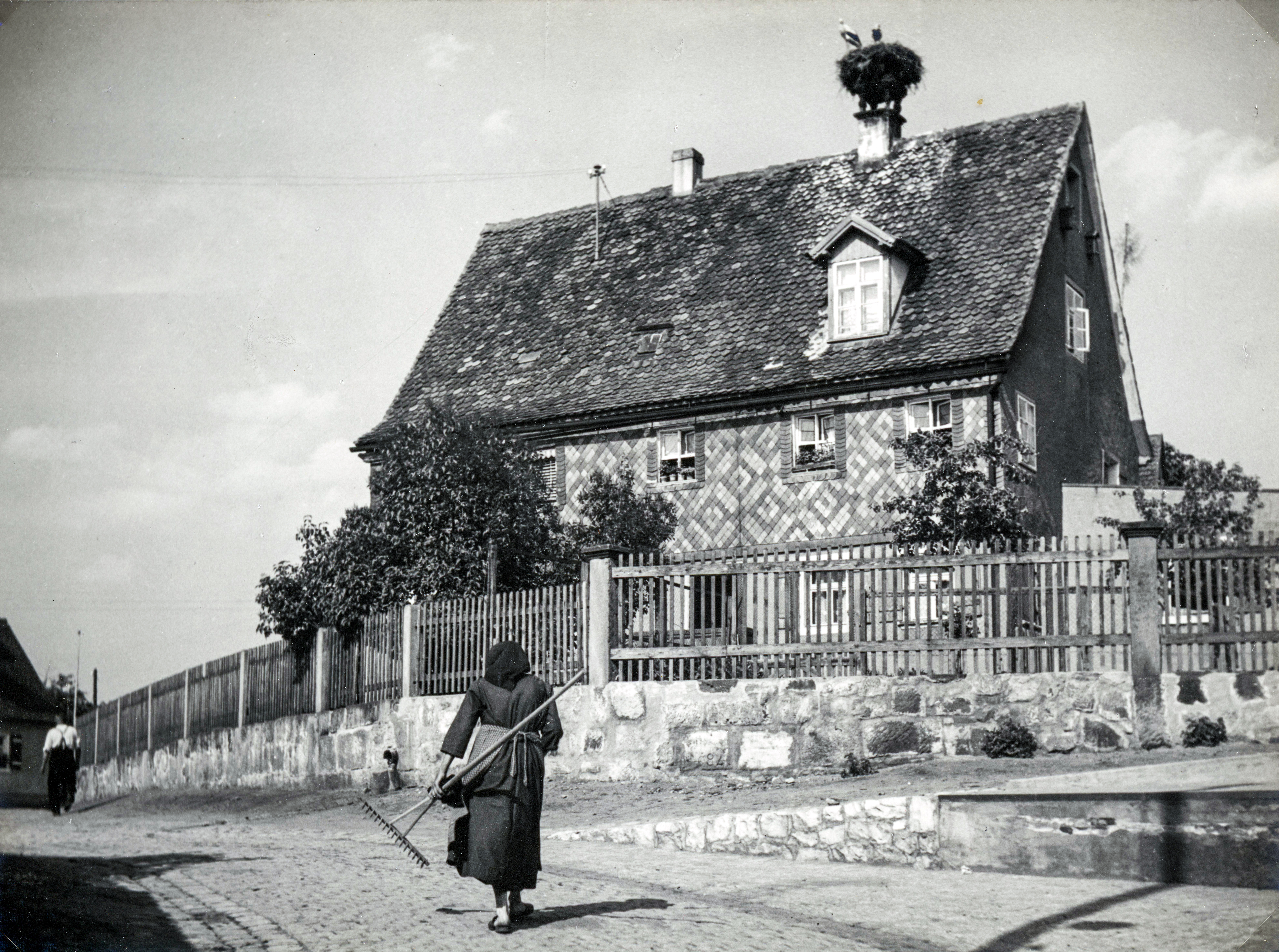| Beschreibung | Bildunterschrift: Feierabend! Storchenhaus mit Tante Kleinlein, ca. 1940 | ||