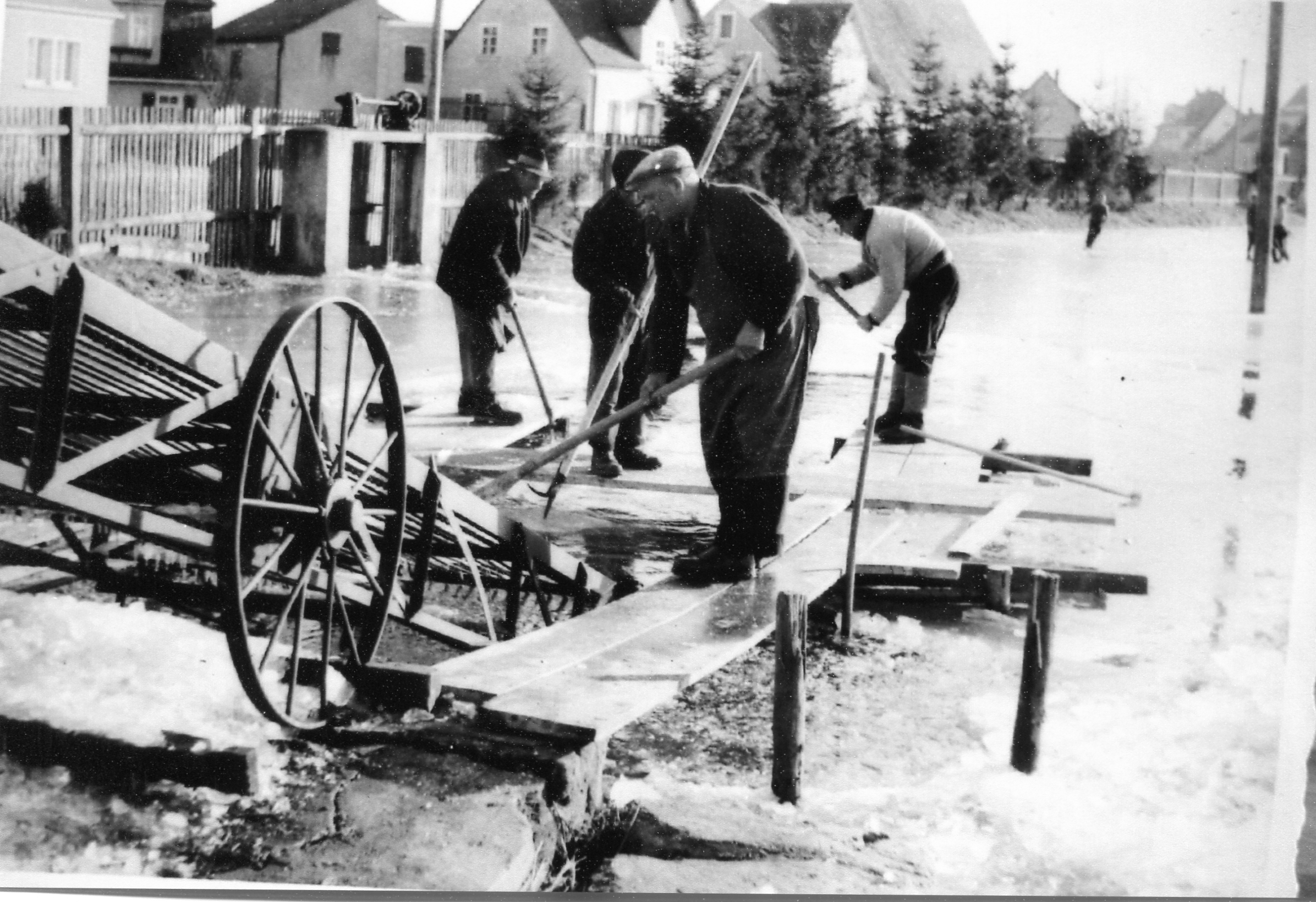 | Beschreibung | Eisblöcke Gewinnung aus einem Weiher für die Kühlung der Dornbräu Vach, Aufnahme von 1956 | ||