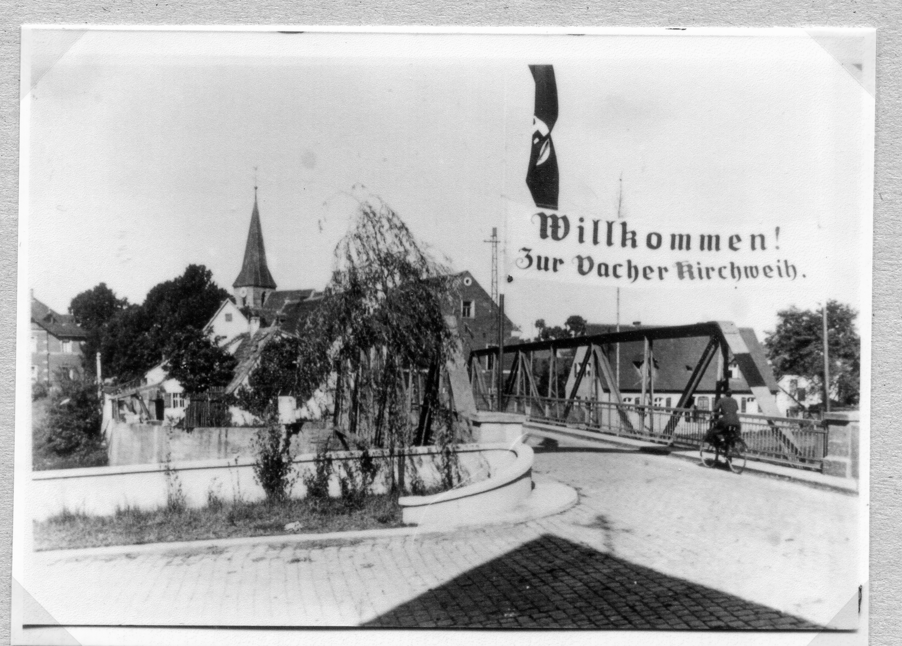 | Beschreibung | Die ehem. stählerne Vacher Regnitzbrücke (1904-1945) mit Hakenkreuzfahne und Plakat zur Kirchweih Vach, ca. 1938 | ||
