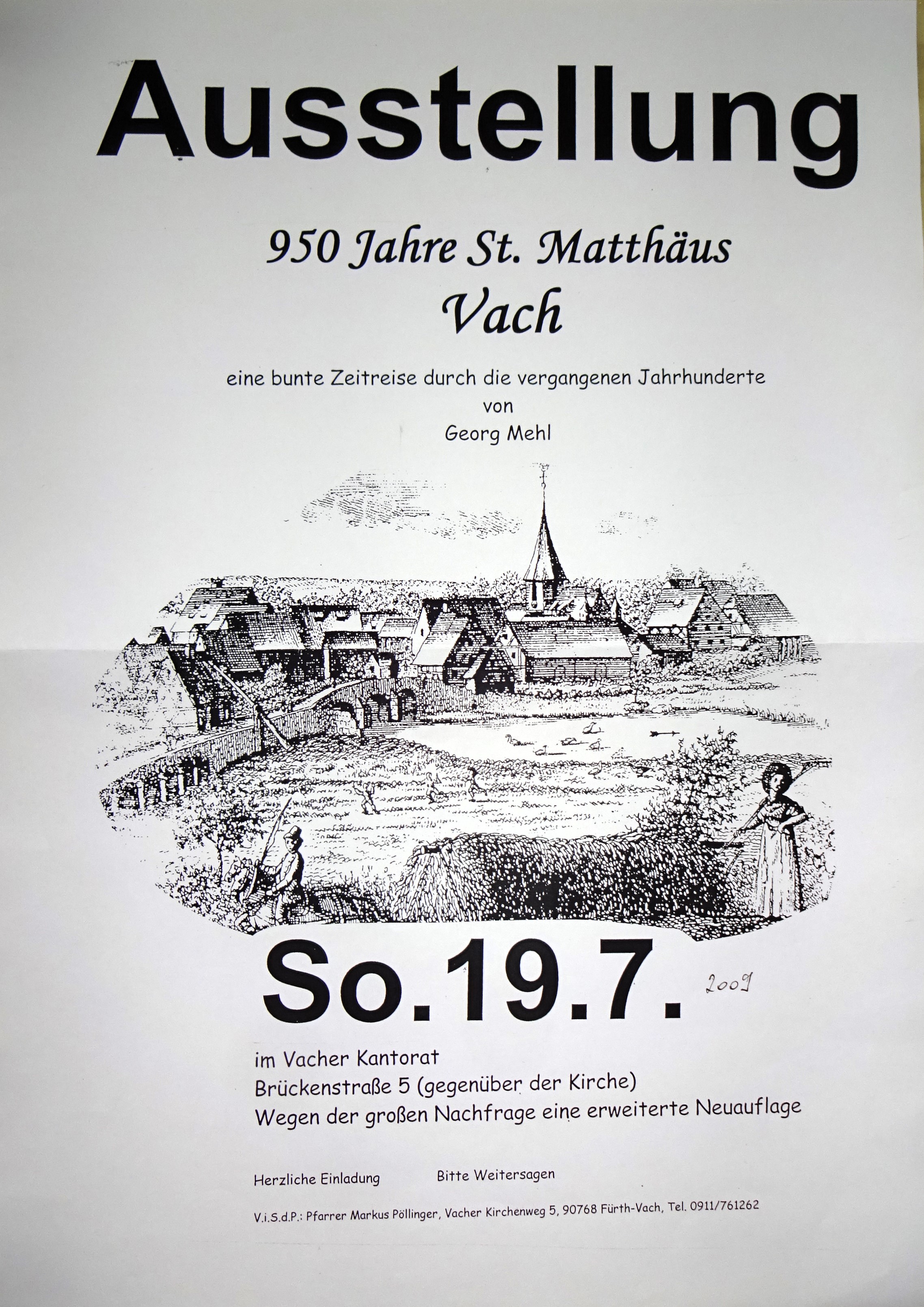 | Beschreibung | Plakat zur Ausstellung "950 Jahre Kirche St. Matthäus" in Vach am 19. Juli 2009 gestaltet von Georg Mehl | ||