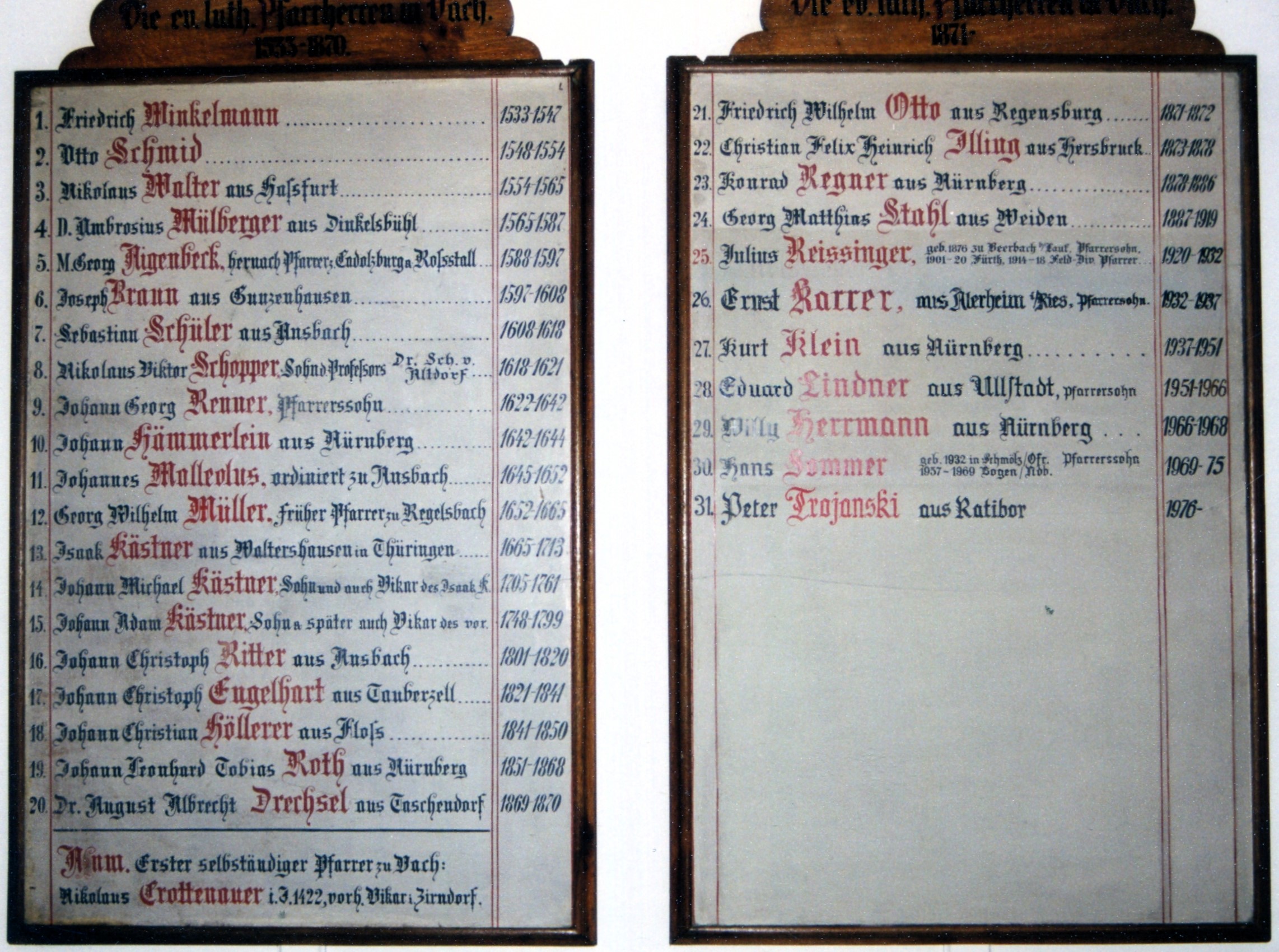 | Beschreibung | gemalte Namenstafel der Pfarrer der Kirche St. Matthäus Vach von 1533 - 1976 Aufnahme von 1992 | ||