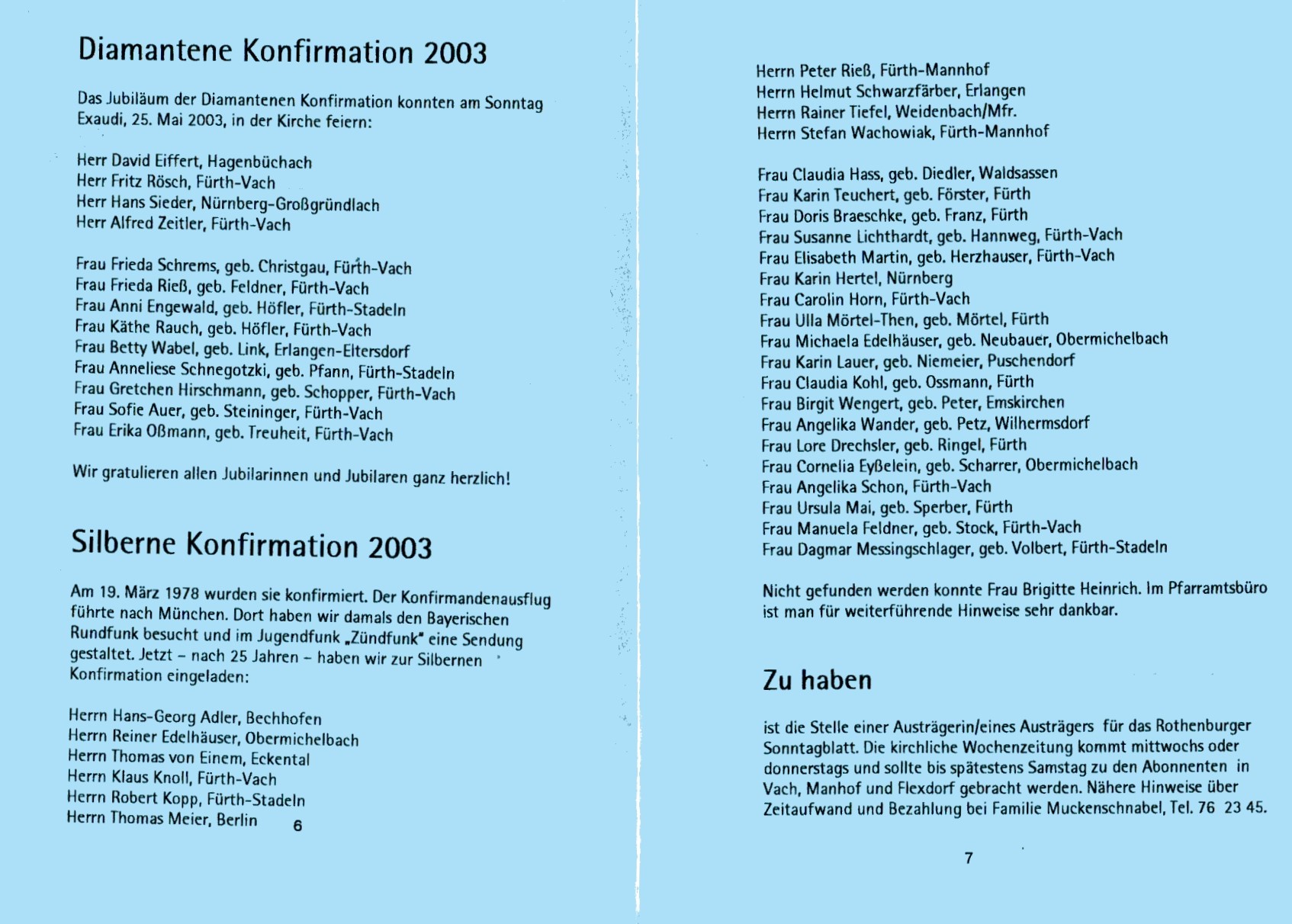 | Beschreibung | Gemeindebrief Auszug Evang. Kirchengemeinde St. Matthäus Vach vom Juni 2003 mit Namensliste der Diamantenen und Silbernen Konfirmation | ||