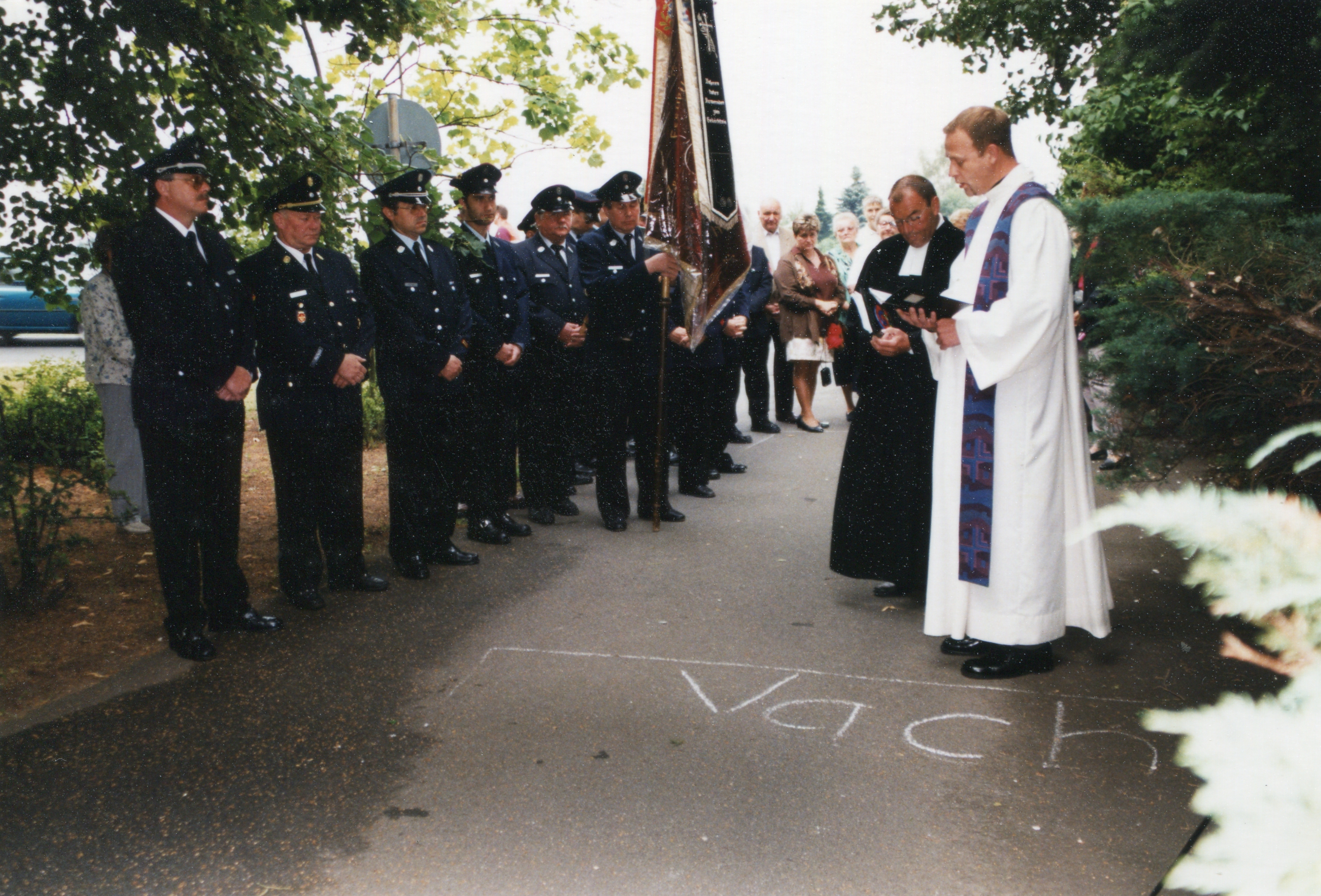 | Beschreibung | 100 Jahr Feier der FFW Mannhof am 27. Juni 1999, Totengedenken mit den Pfarrern Gast Mannhof und Trojanski Vach | ||