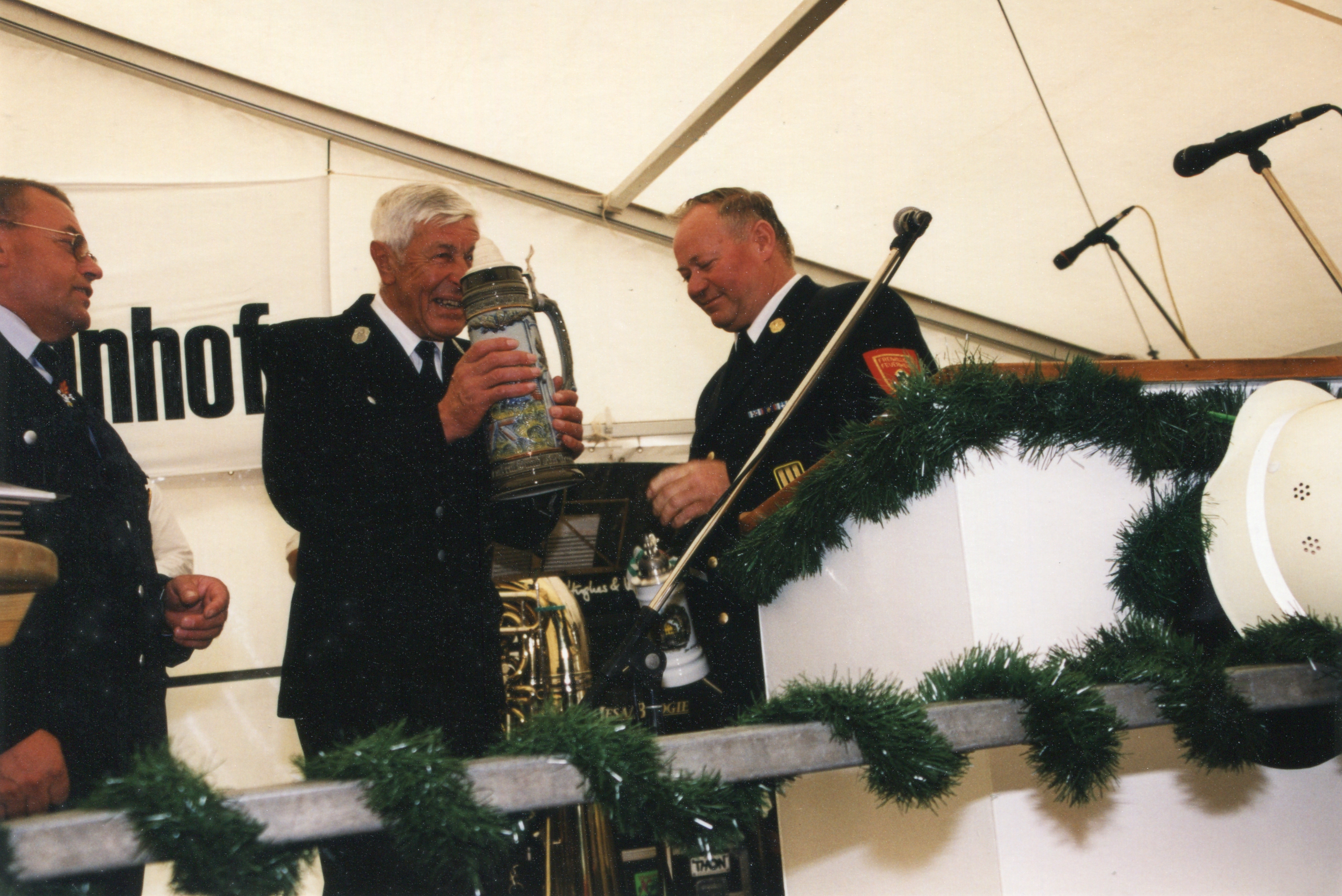 | Beschreibung | 100 Jahr Feier der FFW Mannhof am 27. Juni 1999, Peter Pfann (Stadtbrandinspektor) übergibt einen Festhumpen an Ludwig Bergler | ||
