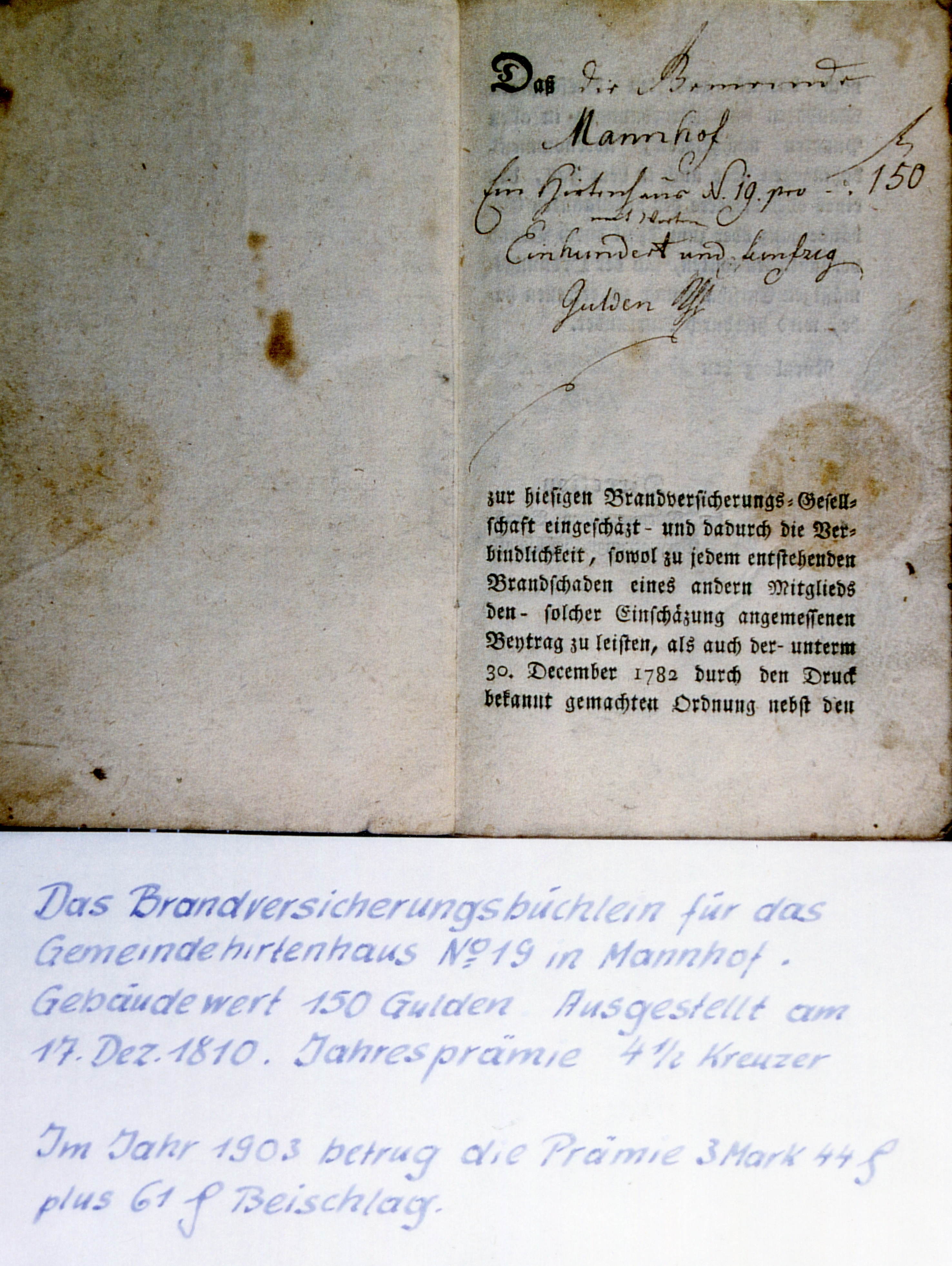 | Beschreibung | Brandversicherungs Büchlein für das Gemeindehirtenhaus Gebäudewert 150 Gulden der Gemeinde Mannhof vom Jahr 1810 mit Erklärung von Georg Mehl | ||