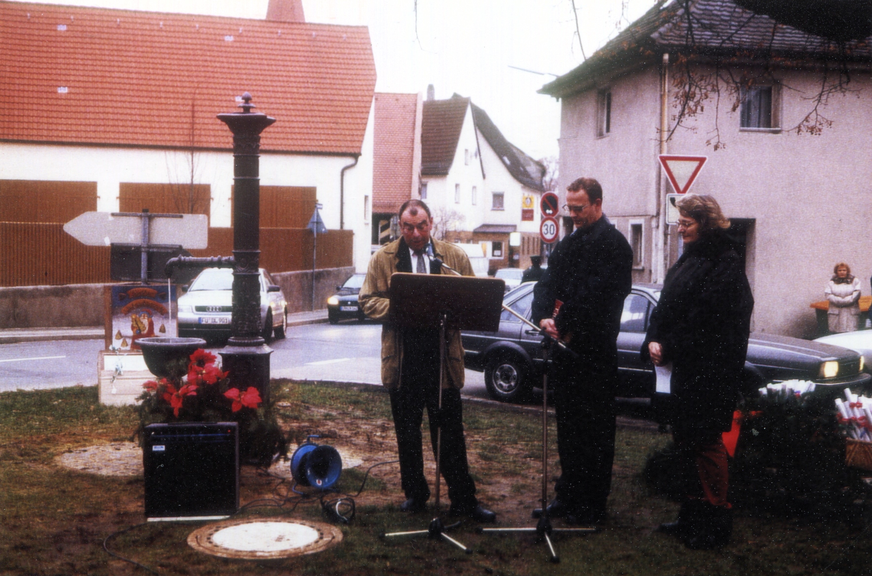 | Beschreibung | Einweihung des Vacher Wasserbrunnens auf der Insel des Vacher Marktplatzes mit den kath. und evang. Pfarrer und der Vorsitzende des Fördervereins "Schöneres Vach" Mai 1998. | ||