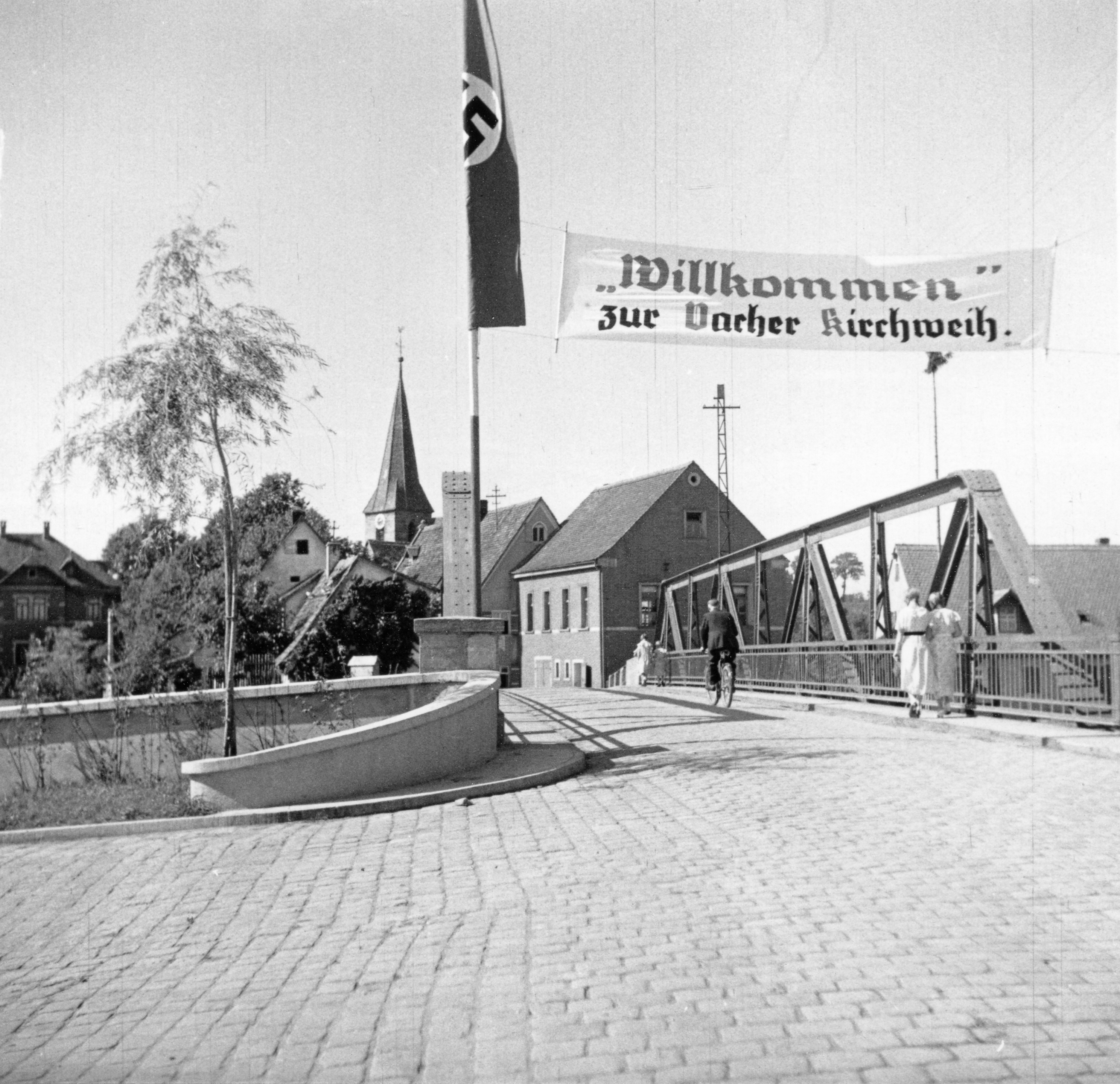 | Beschreibung | Die ehem. stählerne Vacher Regnitzbrücke (1904-1945) mit Hakenkreuzfahne und Plakat zur Kirchweih Vach, im Hintergrund Haus Brückenstraße 11, 11a, 1936 | ||