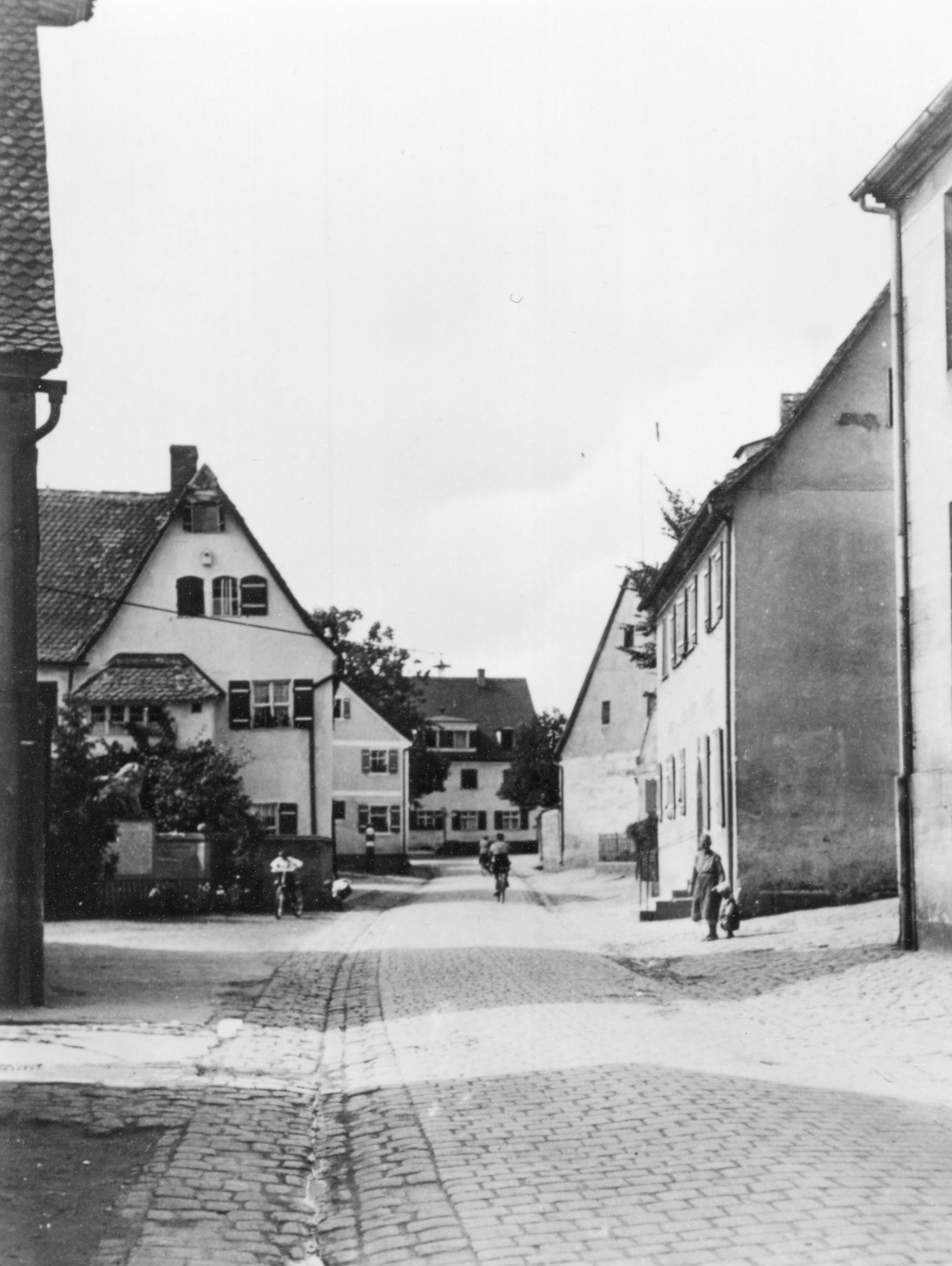 Blick in die kopfsteingepflasterte Brückenstraße mit Kriegerdenkmal und Gebäude dahinter ... Blick in die kopfsteingepflasterte Brückenstraße mit Kriegerdenkmal und Gebäude dahinter Brückenstraße 6 und 2, Gebäude rechts Brückenstraße 3 und 1 dahinter, im Hintergrund Am Vacher Markt, 1936<br>Urheber: Wilhelm Leibenzeder<br>Erstellungsdatum: 1936<br>Lizenz: cc-by-sa-3.0