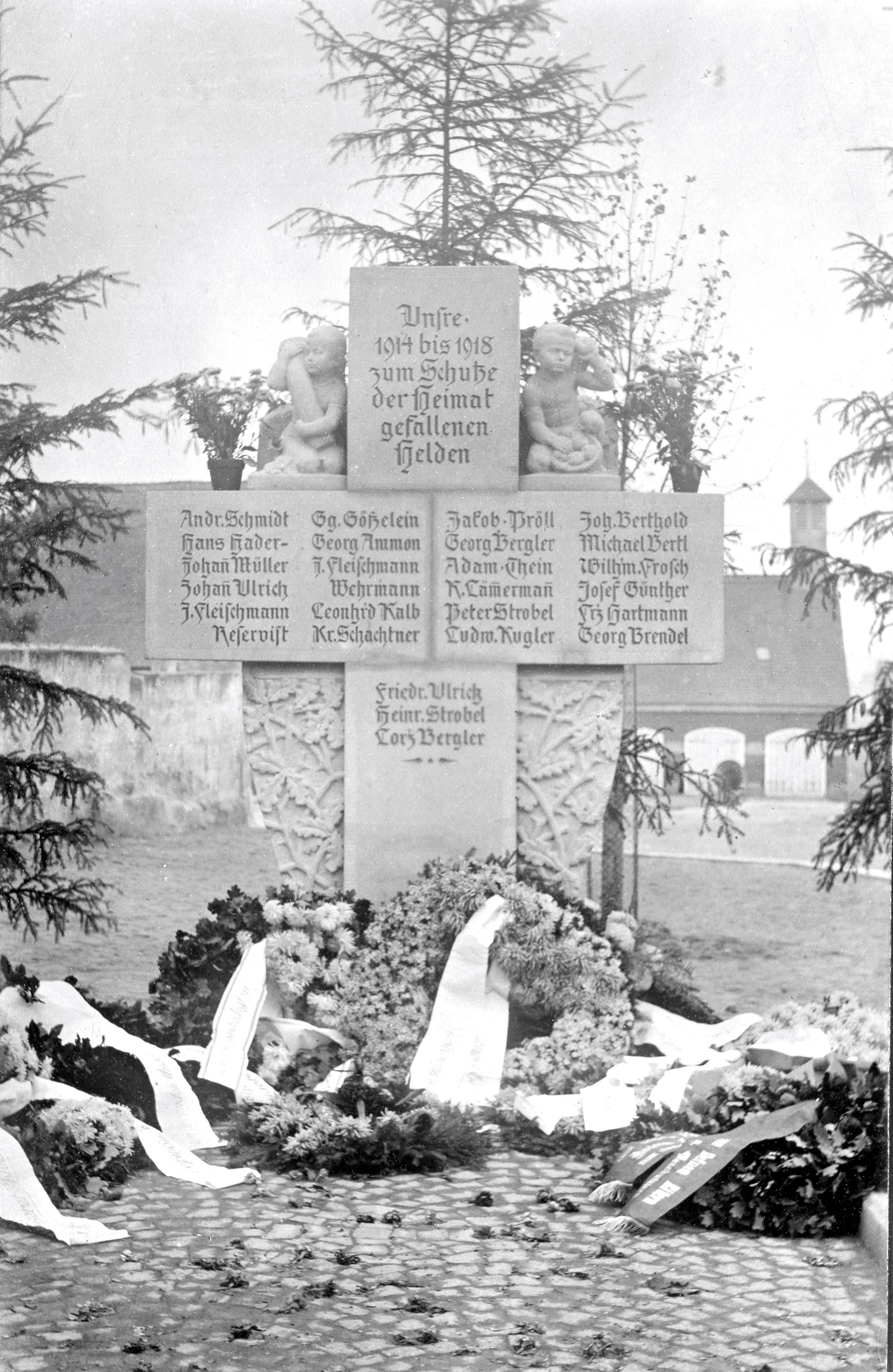 | Beschreibung | Im 3. Reich groß gefeierter "Heldengedenktag" 1938 mit Kranzschmuck am Stadelner Kriegerdenkmal 1914-1918, noch ohne Eintrag der zukünftigen Opfer des 2. WK 1939-1945, früherer Standort am Gästehaus Kalb, im Hintergrund das alte Feuerwehrhaus am Fischerberg 14. | ||