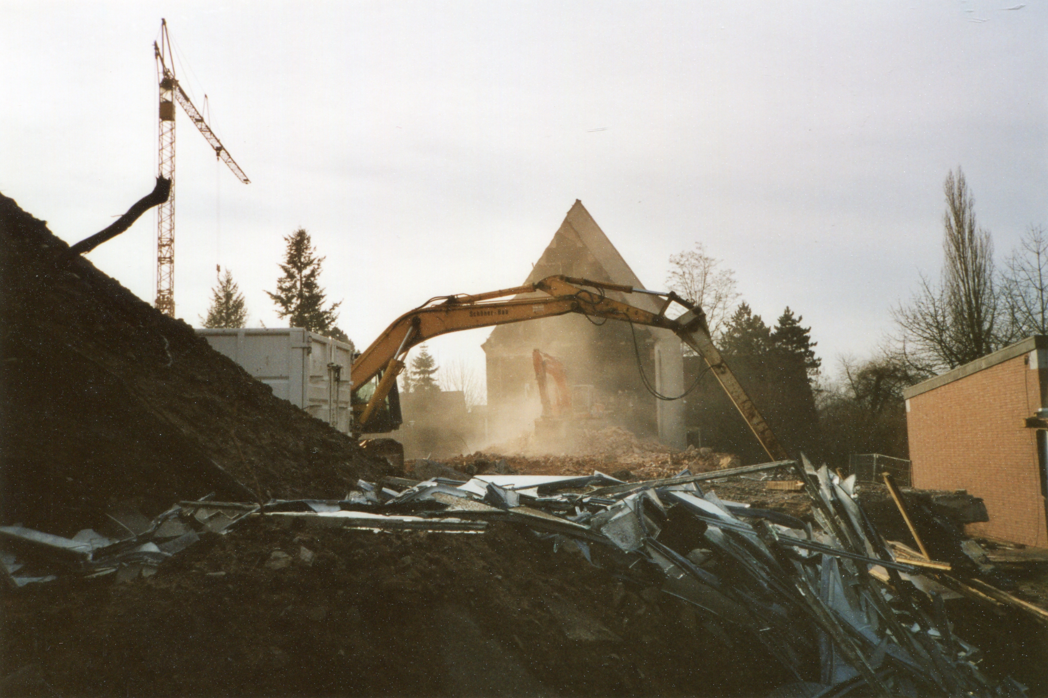 | Beschreibung | Abriss der Gemeinschaftsschule Stadeln, der Nordgiebel der Turnhalle steht noch, Oktober 1999 | ||