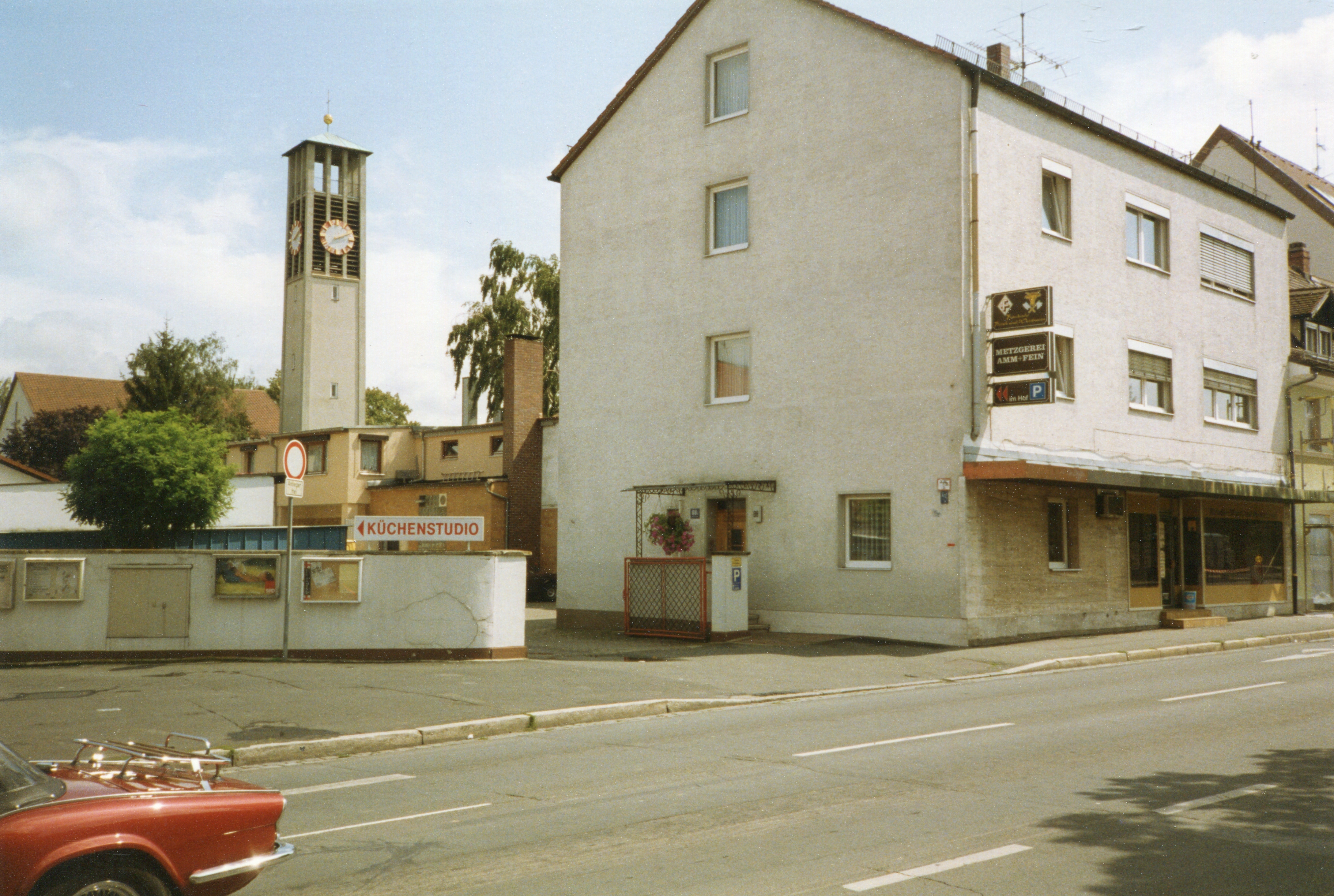 | Beschreibung | Metzgerei Amm in der Stadelner Hauptstraße 88, im Hintergrund die Christuskirche 1980 | ||