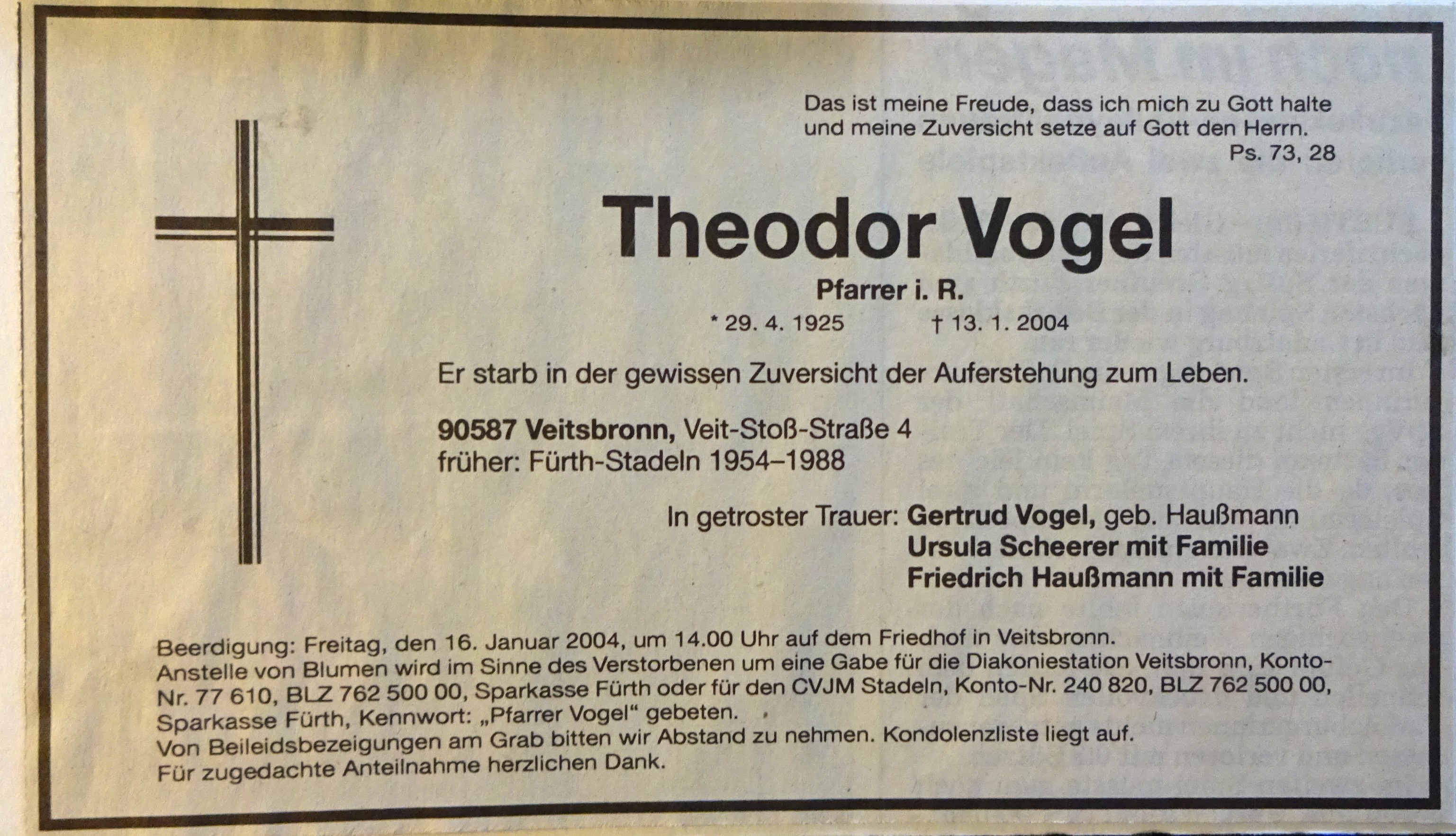 | Beschreibung | Todesanzeige vom ehem. Pfarrer Theodor Vogel, Stadeln, Jan. 2004 | ||