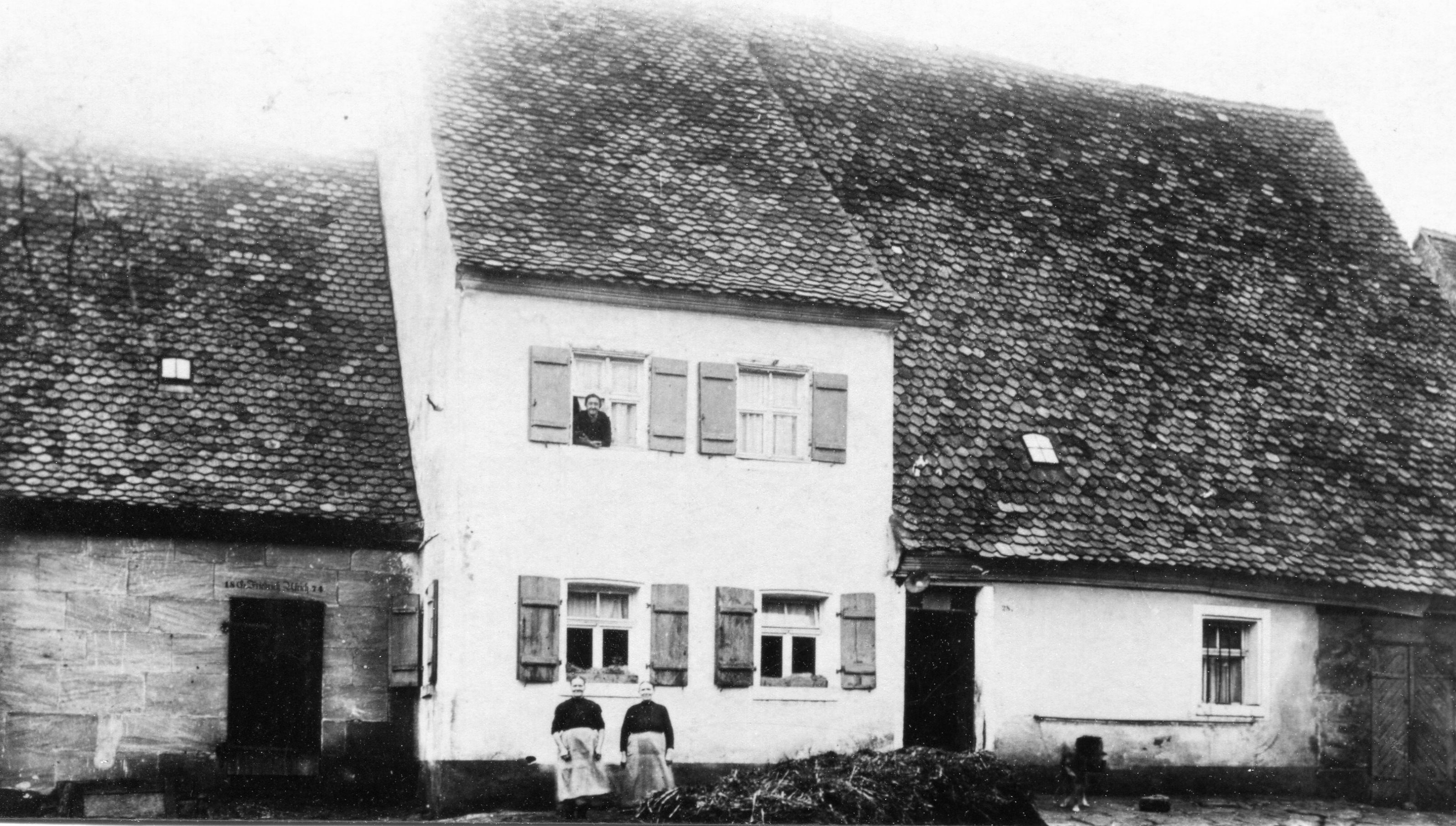 | Beschreibung | Bauernhof alte Nr. 28 heute Fischerberg 8 Wohngebäude von 1874 und alter Scheune, mit oben im Fenster Anna Regina Ulrich, verheirate Leipold, unten Schwester Elisabeth Ulrich und Frau Gulden, Taglöhnerin, wohnte im Haus Nummer 26, Aufnahme nach dem 1. Weltkrieg | ||