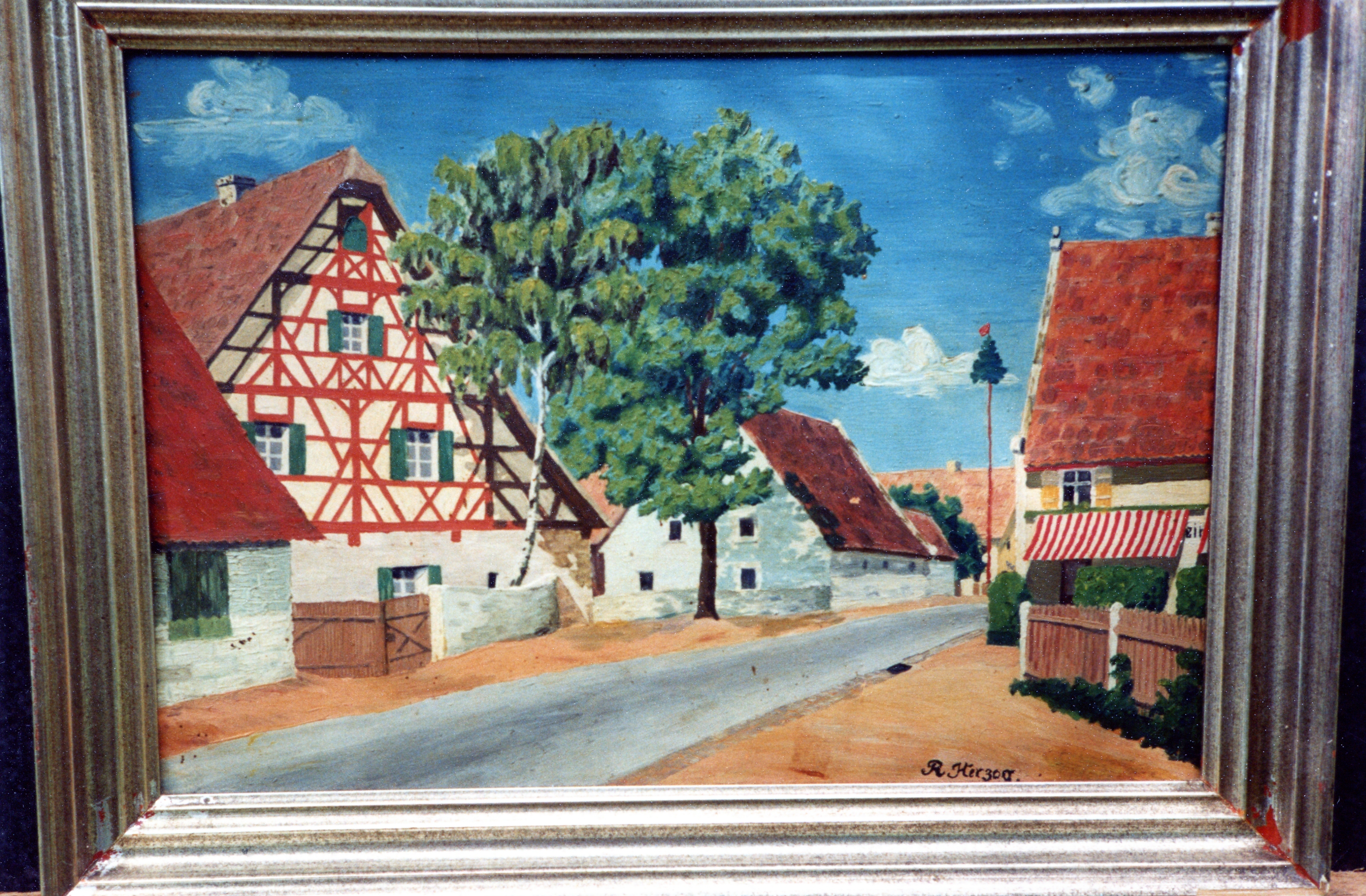 | Beschreibung | Anwesen vlnr. Muggenhöferhaus, Stadelner Hauptstraße 75, Gästehaus Kalb mit Kärwabaum und Café Warmuth, in Stadeln 1939, Gemälde von Rudi Herzog | ||