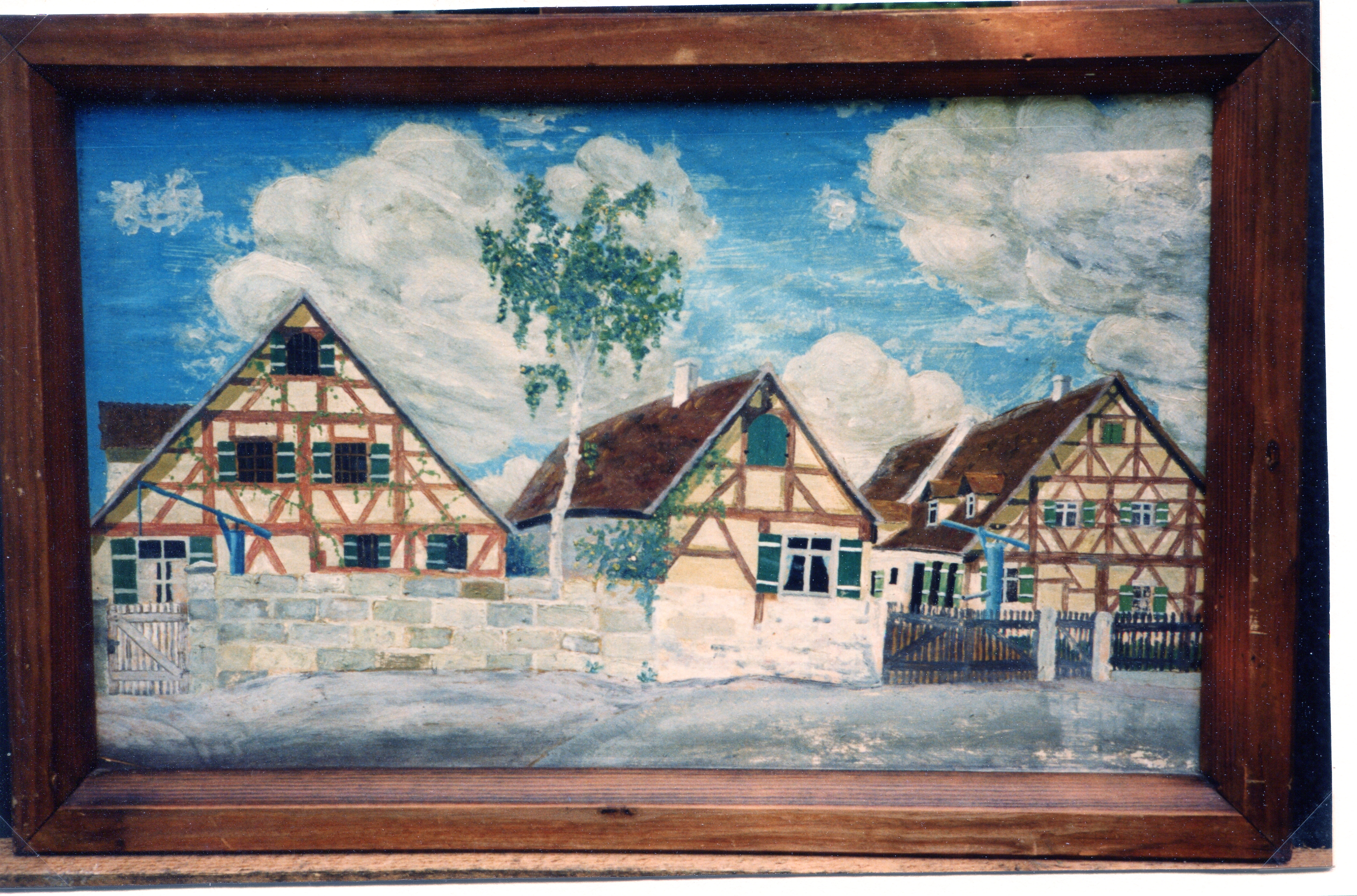 | Beschreibung | Anwesen vlnr. Romminggasse 15 + 17a + 17 in Stadeln 1939, Gemälde von Rudi Herzog | ||