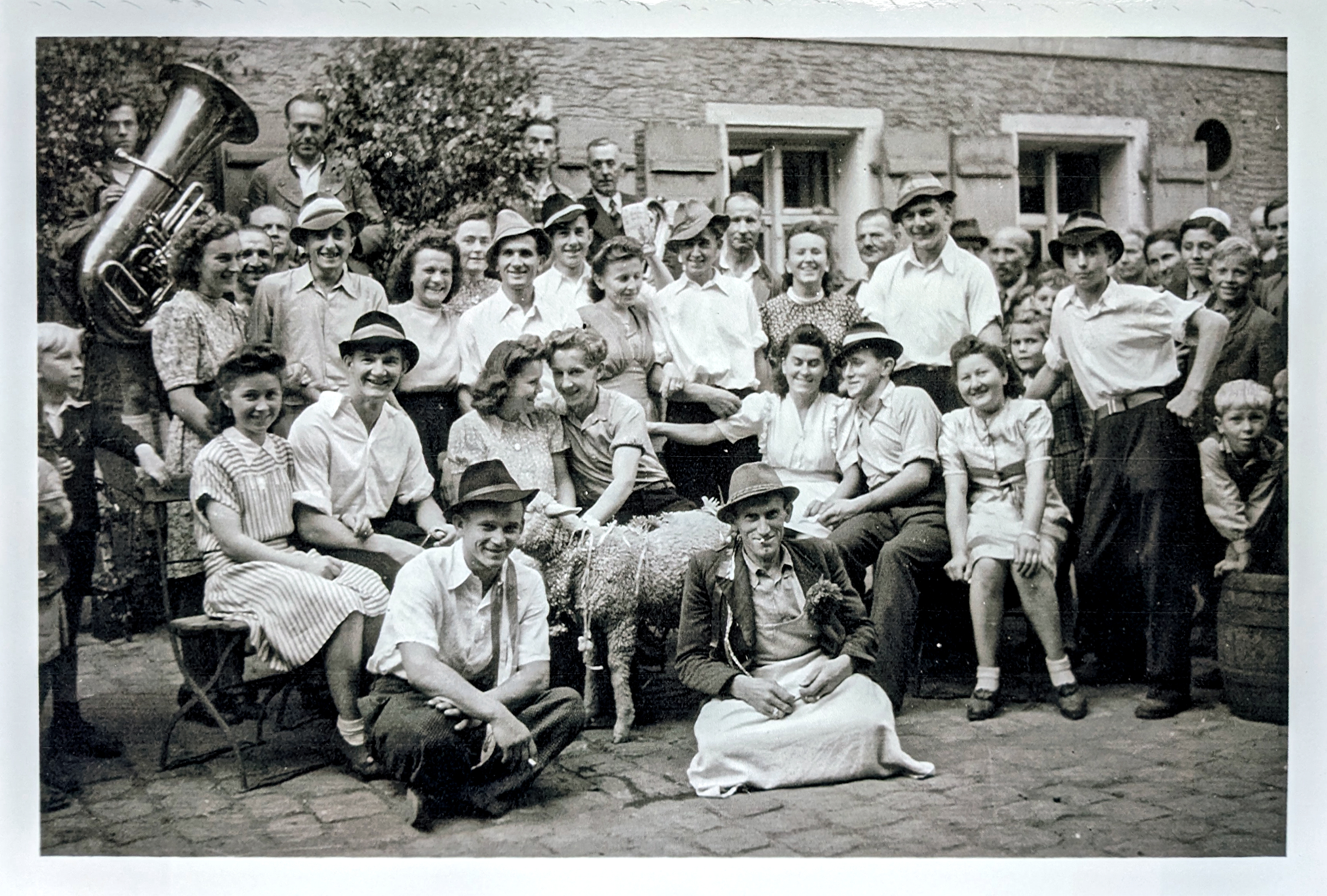 | Beschreibung | Die Kärwaburschen und -madli beim Kalb in Stadeln, 1946 | ||