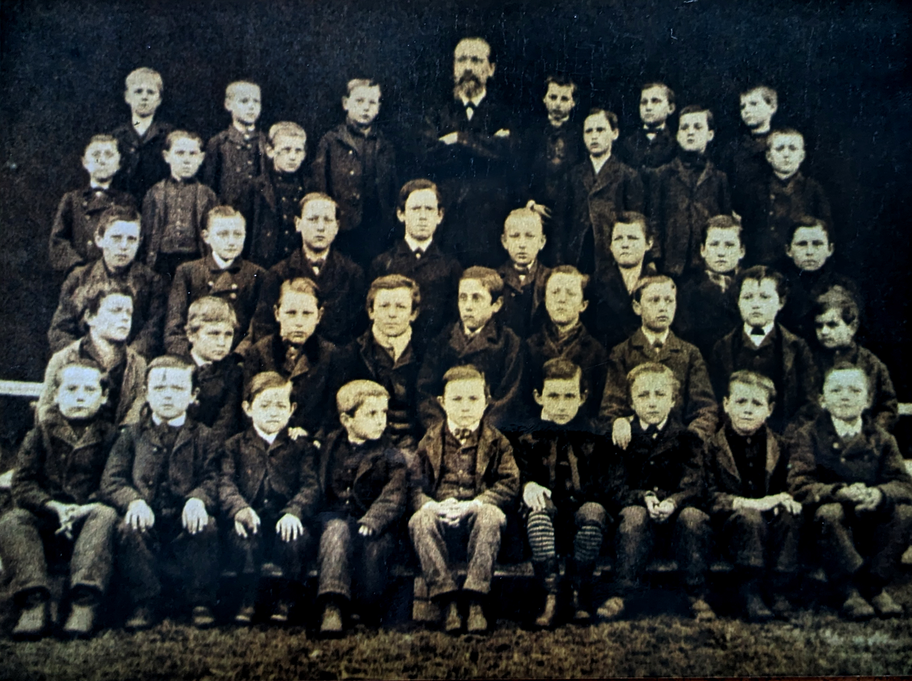 | Beschreibung | Hauptlehrer Valentin Schlegel mit Buben Jahrgang 1881-1885 seiner Schulklasse in Stadeln, 1885 | ||