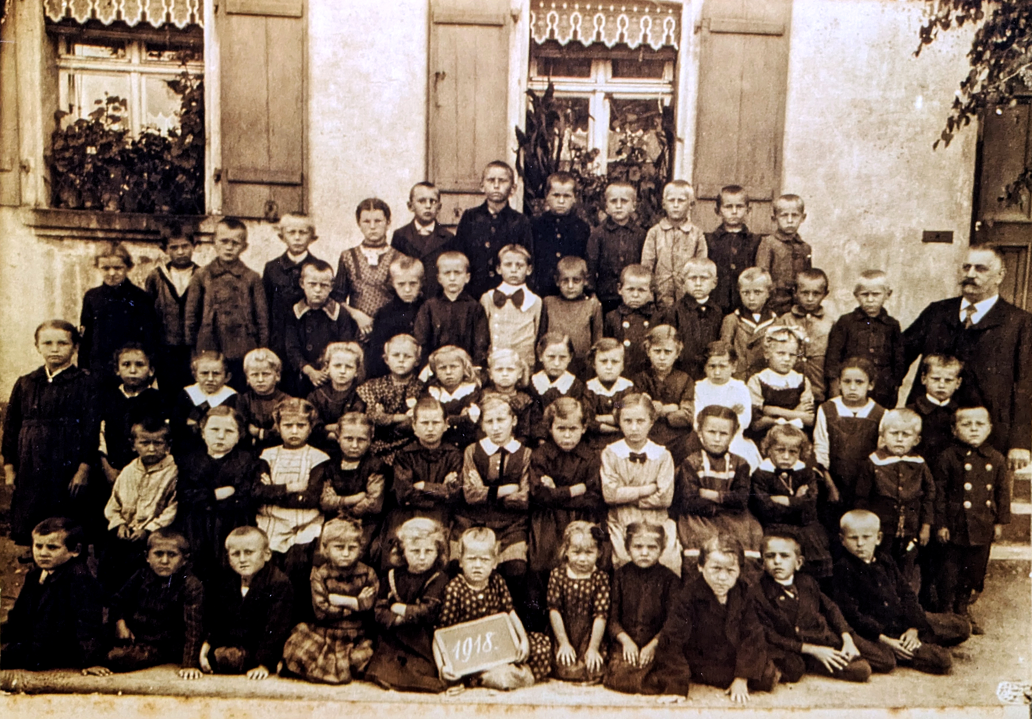 | Beschreibung | Hauptlehrer Engelhard mit seiner Schulklasse in Stadeln, 1918 | ||