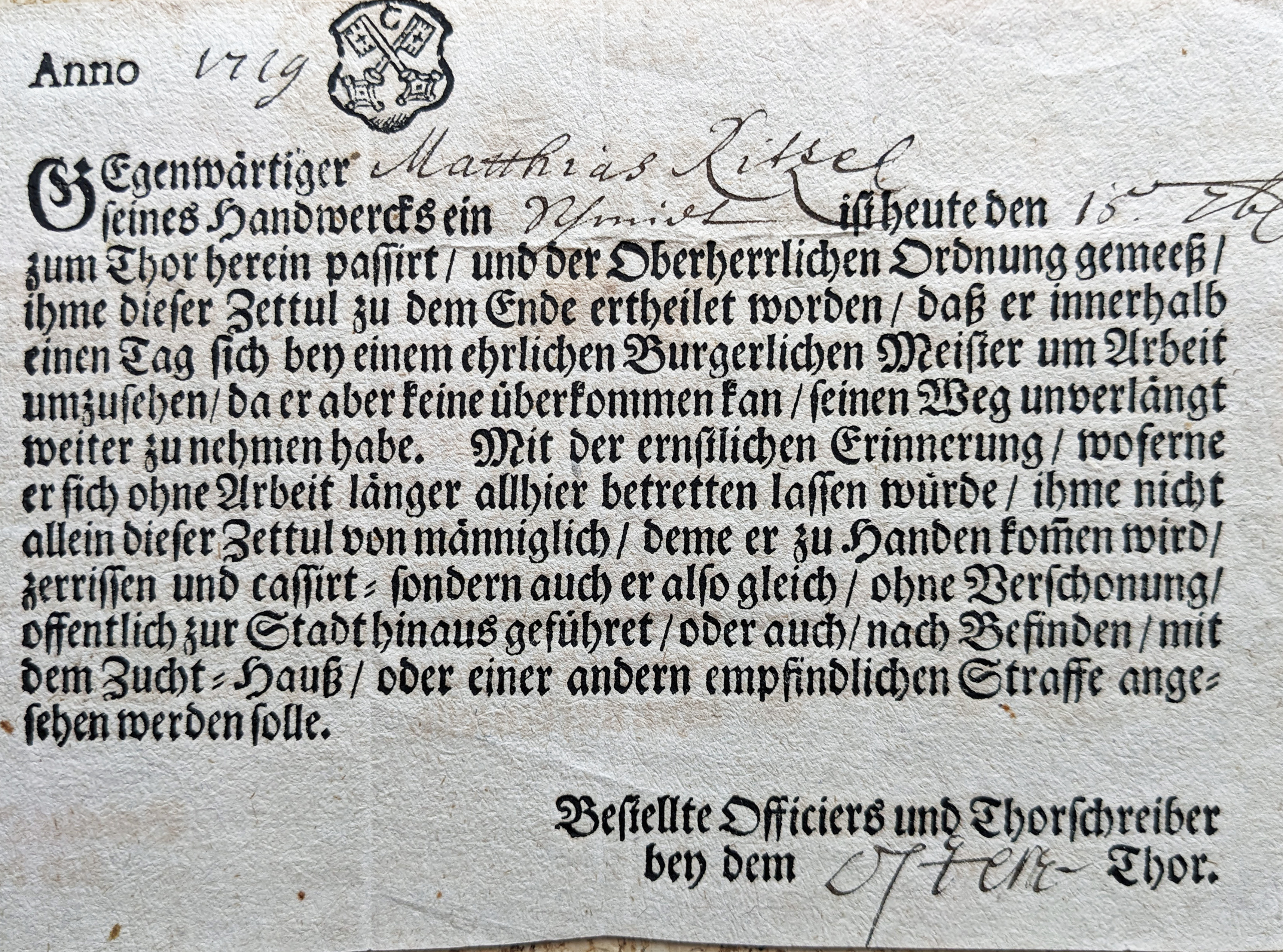 | Beschreibung | Passierschein für einen Handwerksburschen aus dem Jahr 1719. | ||
