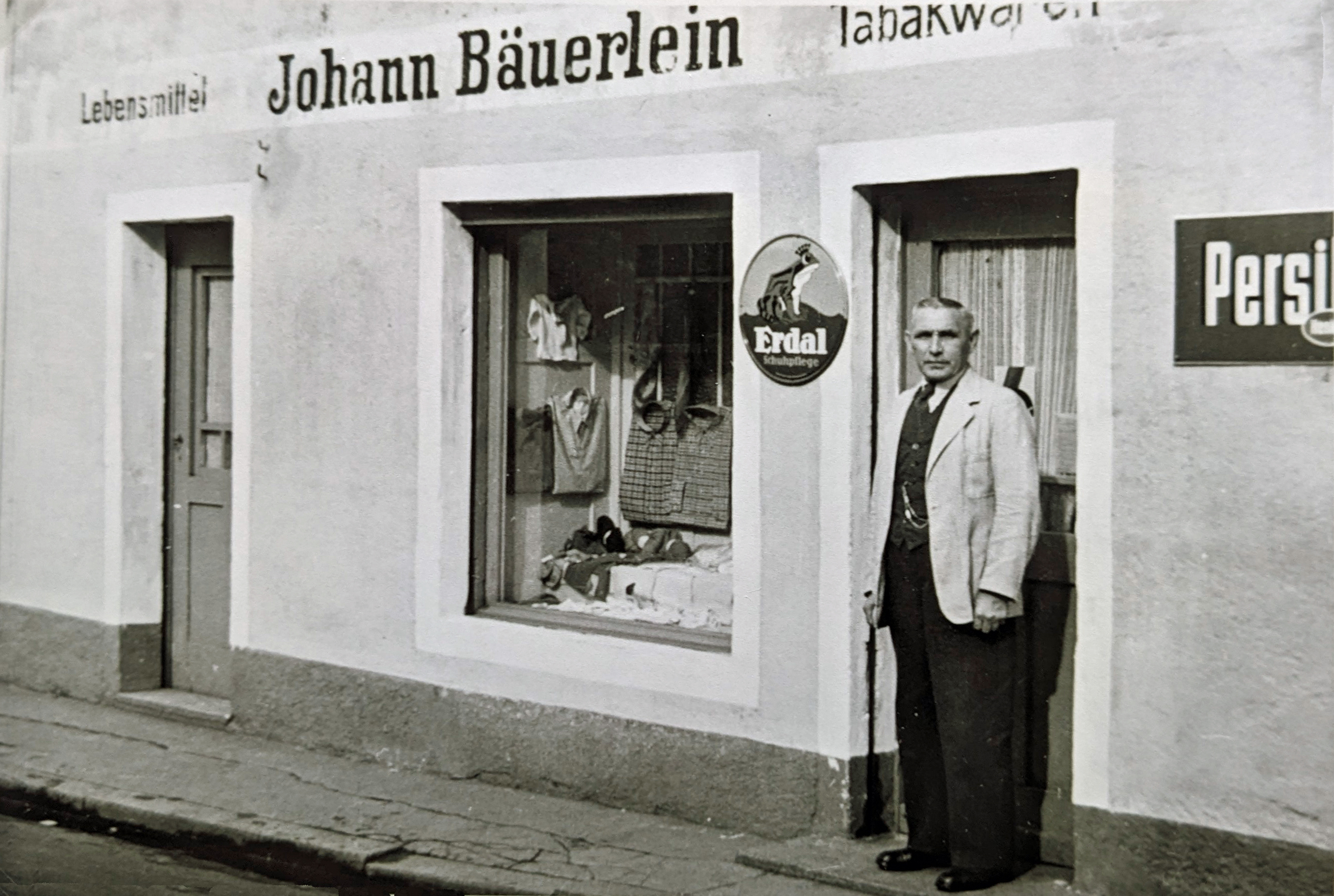 | Beschreibung | Johann Bäuerlein vor seiner Spezereihandlung in Stadeln, um 1950. | ||