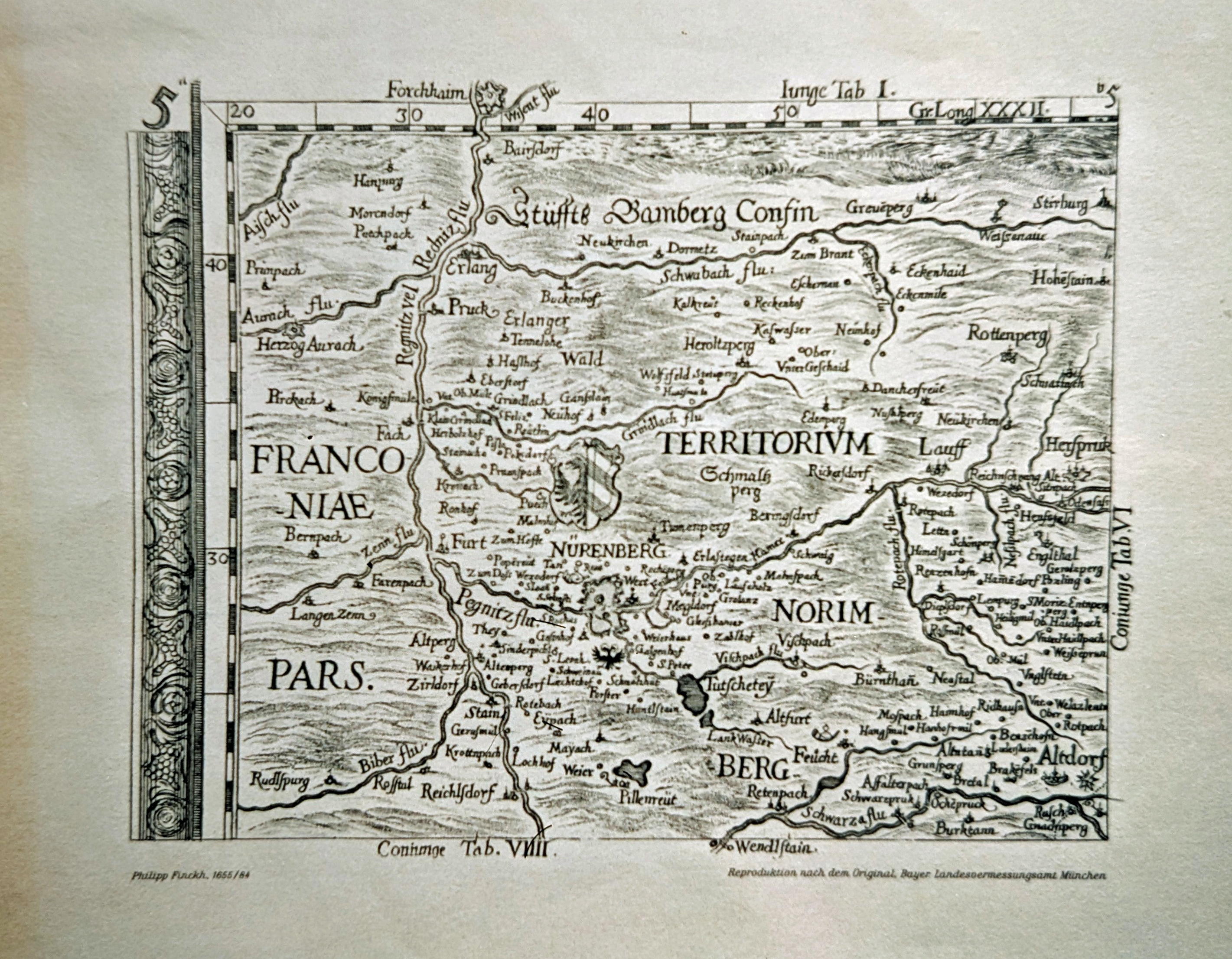 | Dateiinfo (Bild-Unterschrift und Info-Box, automatisch erstellt) | Die Landkarte aus dem Jahr 1655 zeigt den Großraum um Fürth. Urheber: Philipp Finckh<br><br>Lizenz: cc-by-sa-4.0 | ||