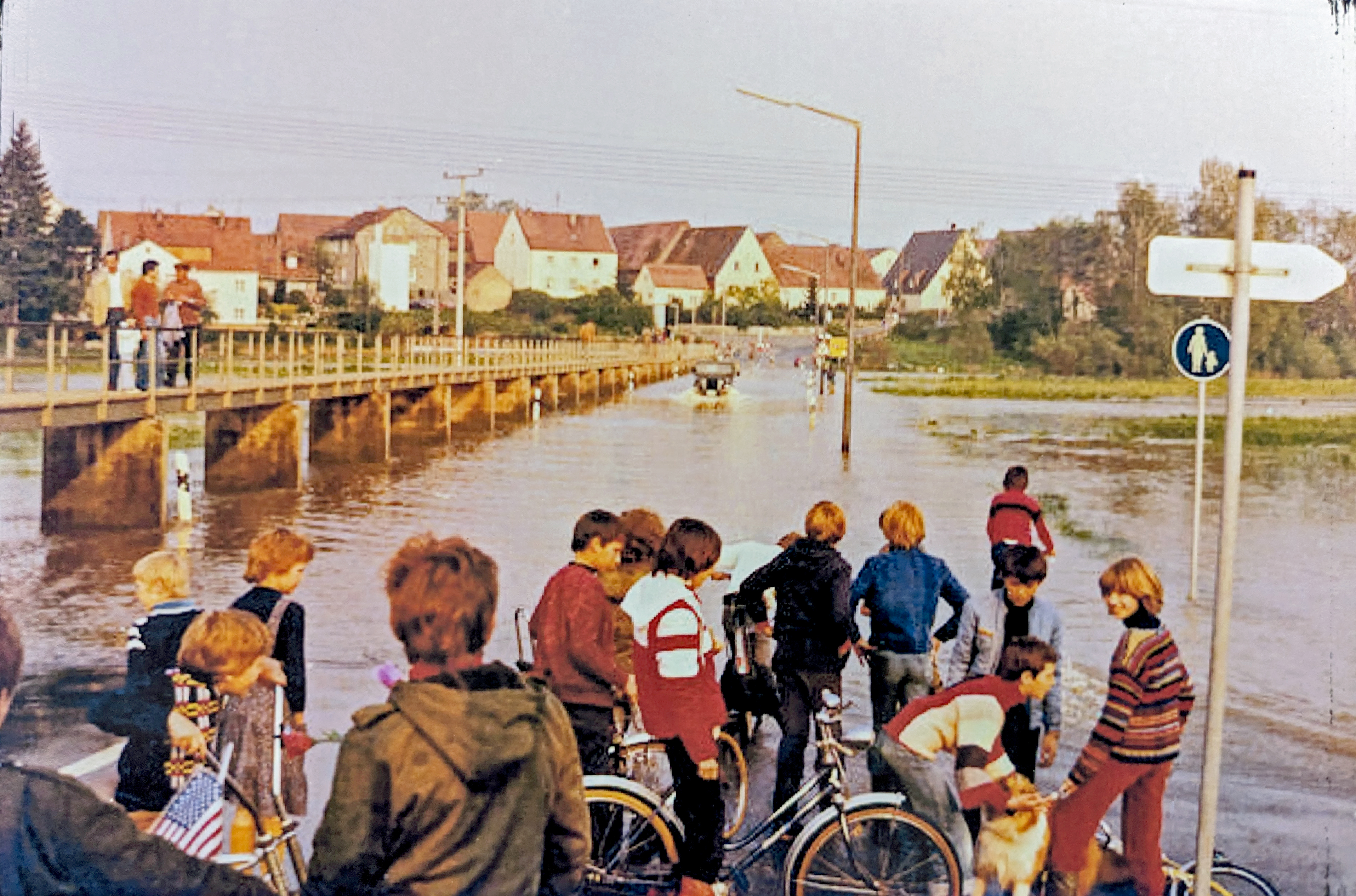 | Beschreibung | Der Talübergang und der alte Fußgängersteg zwischen Vach und Mannhof bei Hochwaser, 1970er Jahre | ||