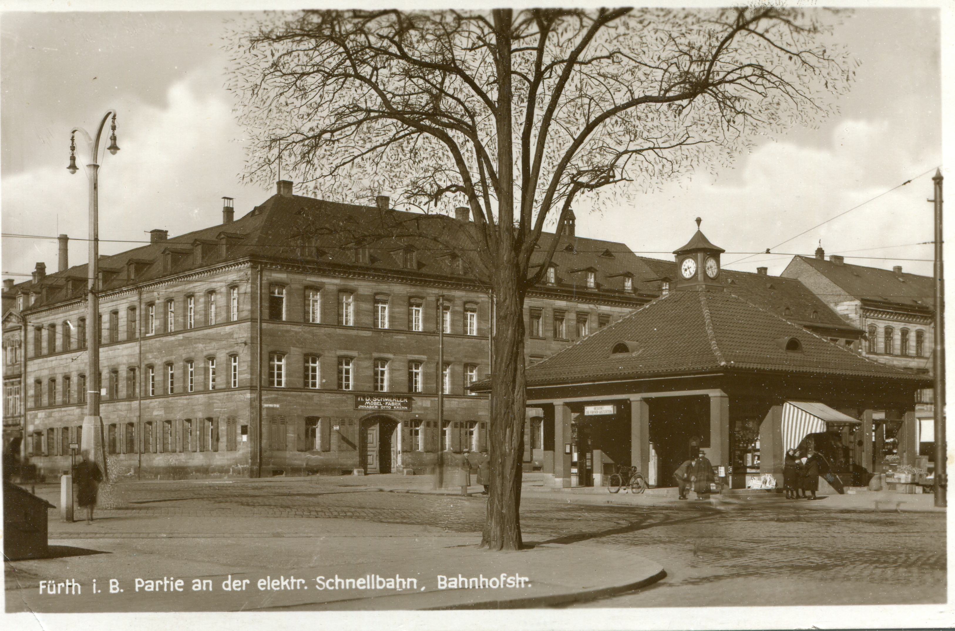 | Beschreibung | Ansichtskarte der ehem. Bahnhofstraße mit Vorgängerbau des späteren Quelle Kaufhauses Fürther Freiheit 8, 10, der Straßenbahn Kiosk wurde mit dem dahinterliegenden Ludwigsbahnhof auf dem umbenannten "Schlageterplatz" 1938 abgerissen, AK nicht gelaufen, von 1936 | ||
