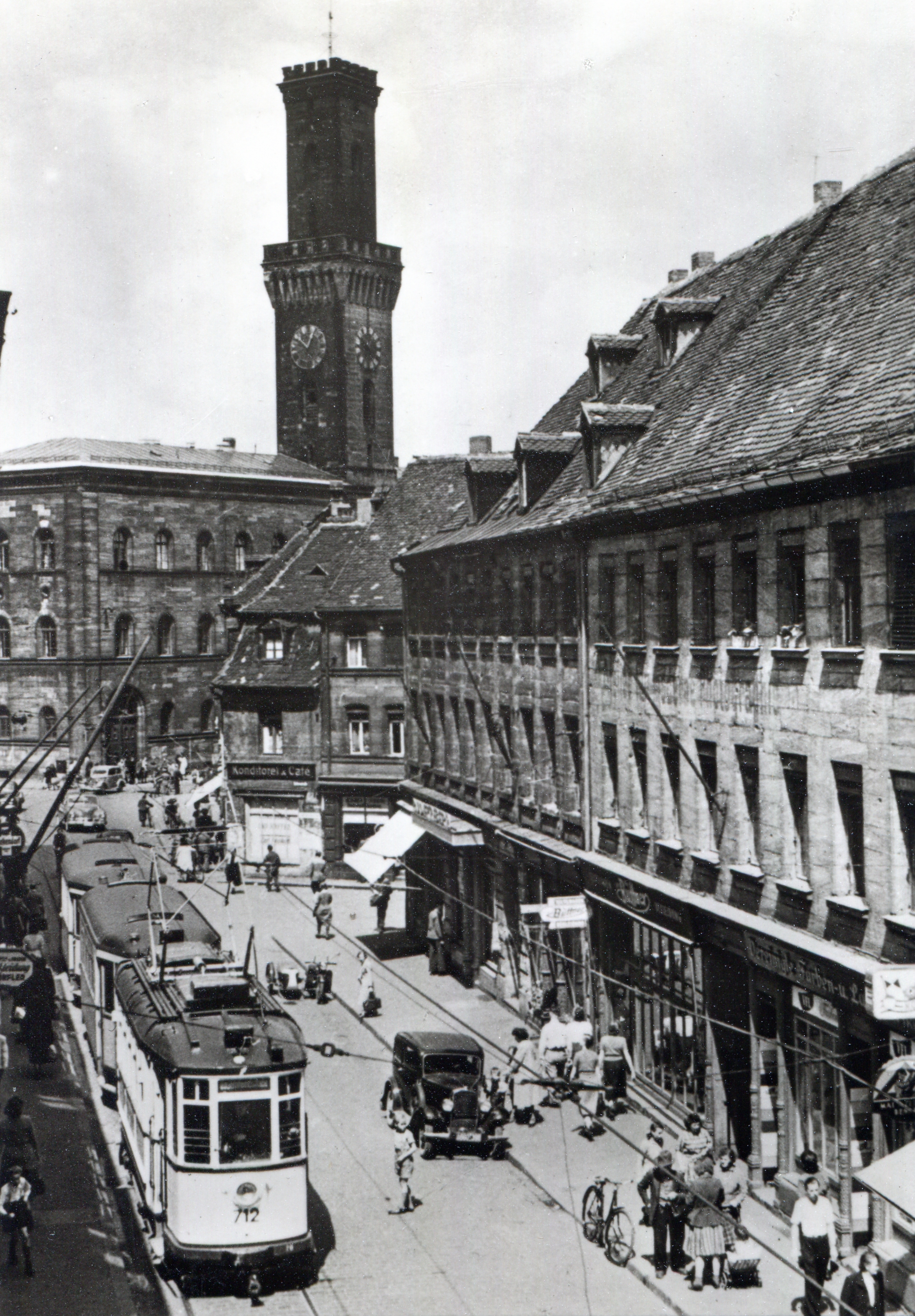 | Beschreibung | Ansichtskarte Straßenpartie untere Schwabacher Straße mit Gebäude Nr. 3 und 1 rechts, dahinter Kohlenmarkt 1, 2, Straßenbahn TW 712 Bj. 1925 Linie 1, AK nicht gelaufen, von 1951 | ||