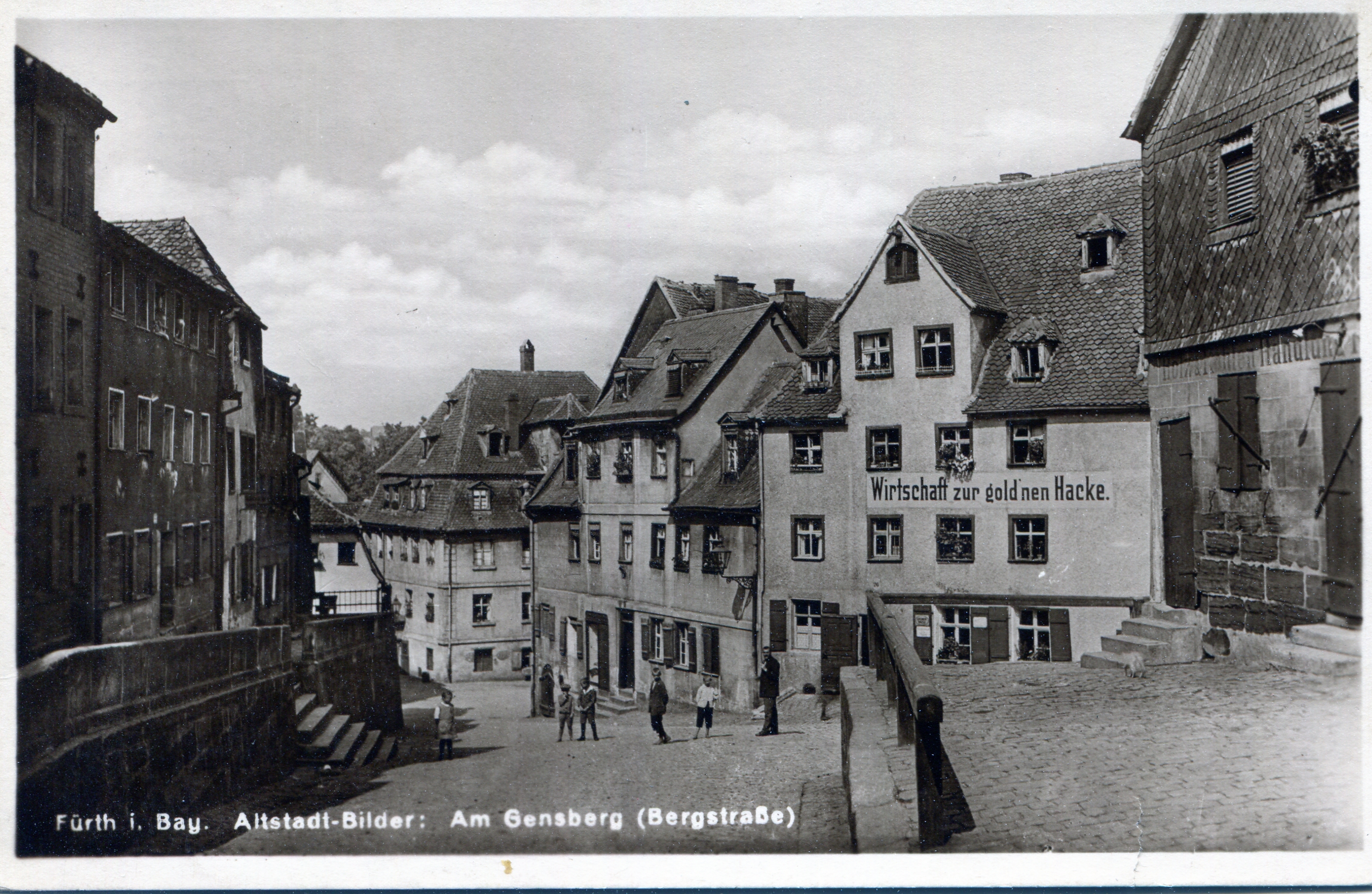 Ansichtskarte vom Gänsberg um ca. 1925 rechts Bergstraße 26 (Wirtschaft Zur Goldenen Hacke), ... Ansichtskarte vom Gänsberg um ca. 1925 rechts Bergstraße 26 (Wirtschaft Zur Goldenen Hacke), Bergstraße 28, Königstraße 4, links Bergstraße 21 u.a.<br>Urheber: Verlag Ludwig Riffelmacher Fürth<br>Erstellungsdatum: 1925<br>Lizenz: cc-by-sa-4.0