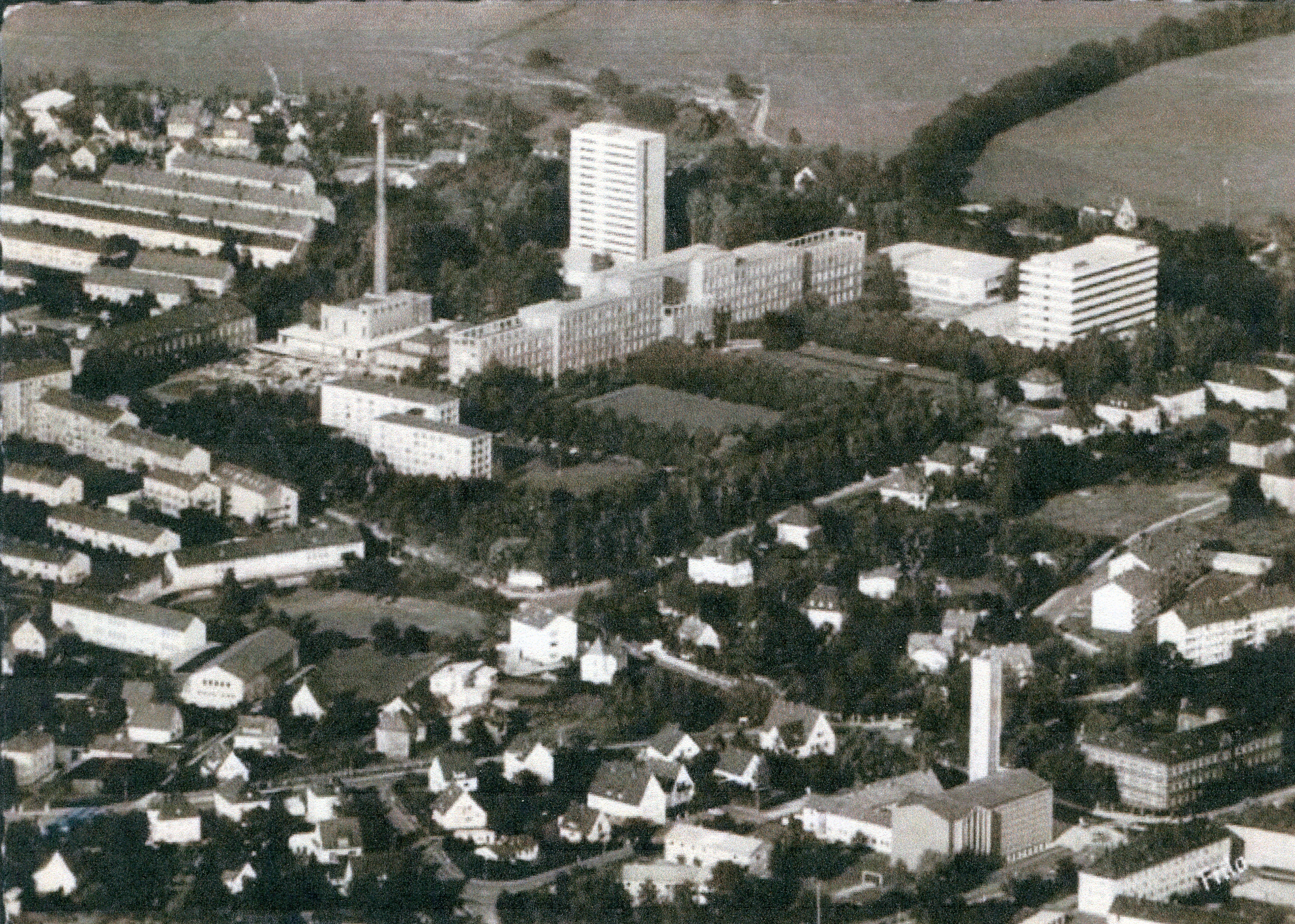 | Beschreibung | Luftbild baumreiches Klinikum mit Kinderklinik und Schwesternhaus, Christkönig-Kirche und Altbau Grete-Schickedanz-Heim unten, querverlaufen diue Friedrich-Ebert-Straße, Aufnahme ca. 1980 | ||