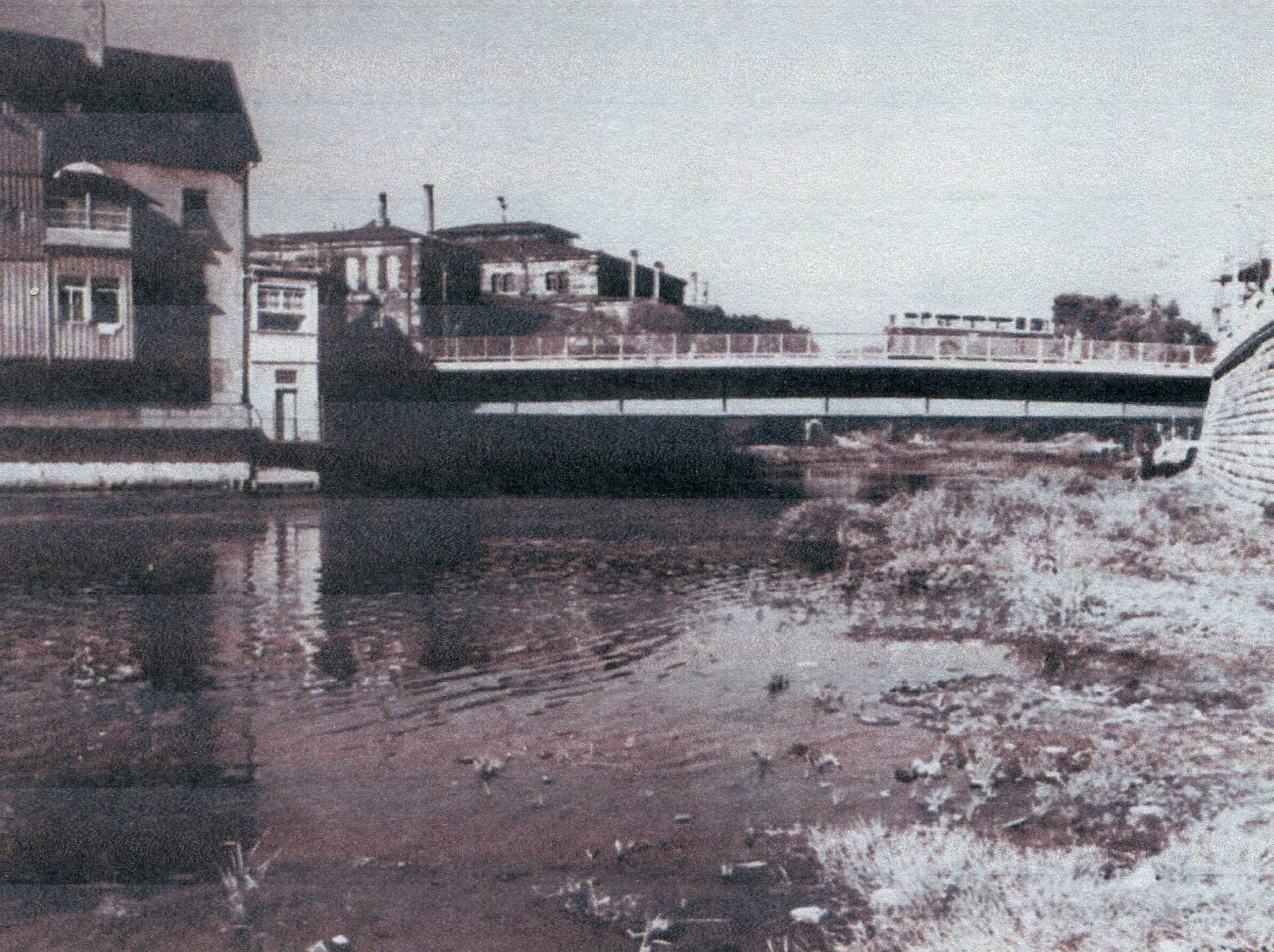 | Beschreibung | die Rednitz mit der ehem. Maxbrücke und der 1995 abgerissenen Gaststätte Fischhäusla, im Hintergrund Alter Schlachthof heute Kulturforum, Aufnahme 1980 | ||