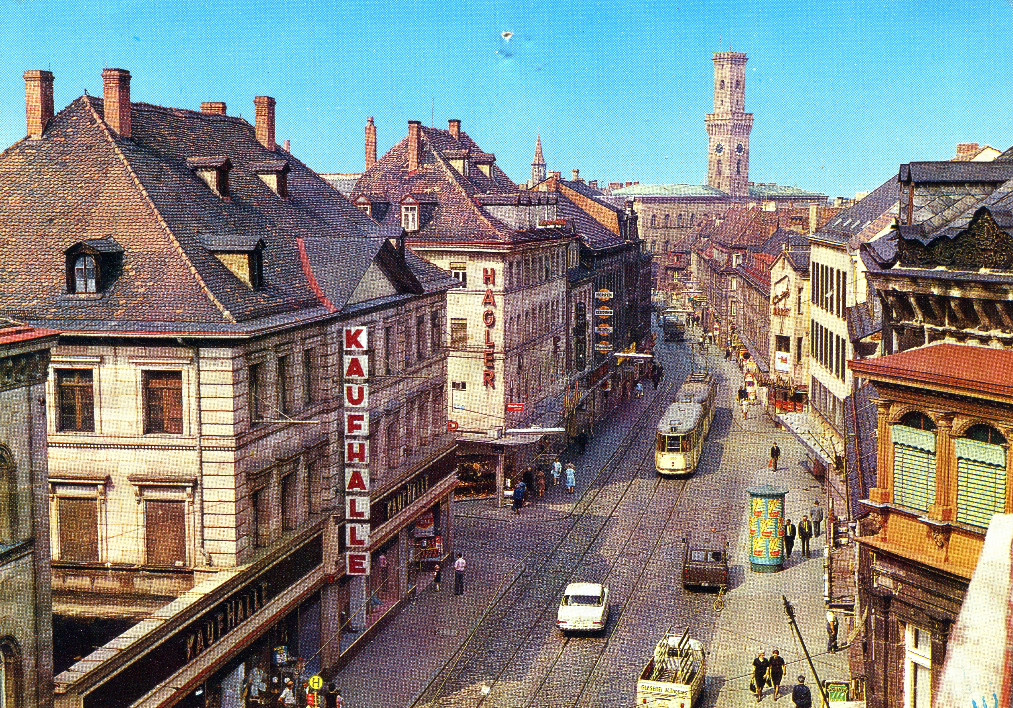 | Beschreibung | Ansichtskarte mit Blick in die heutige Fußgängerzone Richtung Rathaus, ca. 1975 | ||