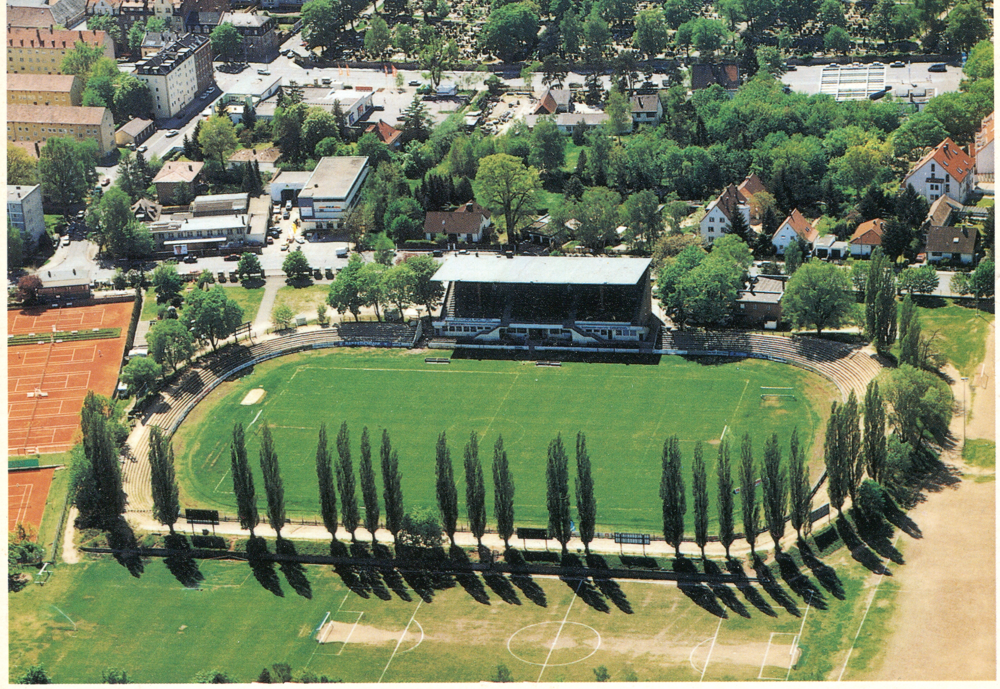 | Beschreibung | Ansichtskarte Kuftbild vom SpVgg Gelände mit Laubenweg, Mauerstraße und Erlanger Straße, oben Teil vom Friedhof, Aufnahme vom 3. Mai 1994 | ||