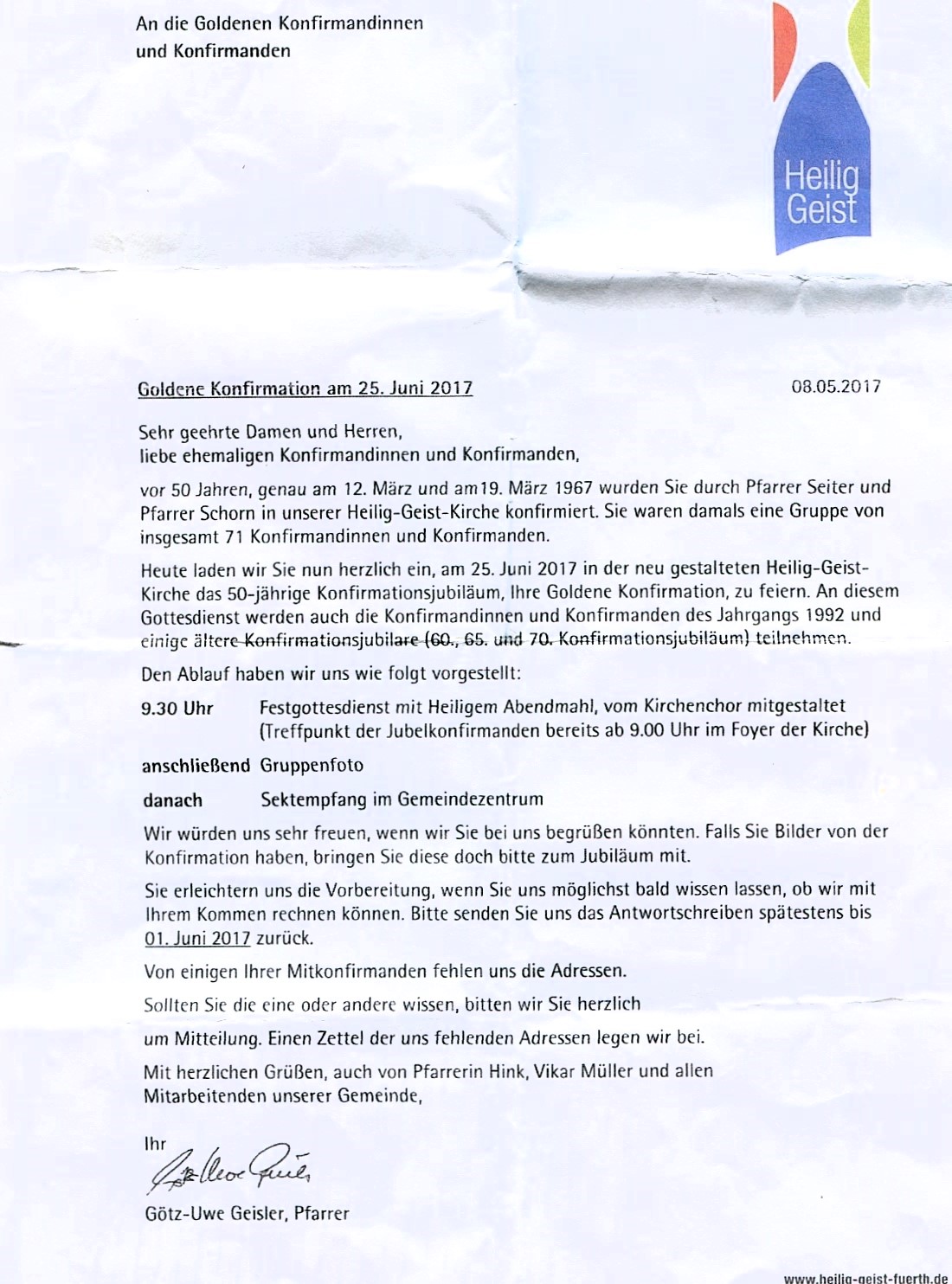 | Beschreibung | Einladung der Kirchengemeinde zur Goldenen Konfirmation am 25. Juni 2017 | ||