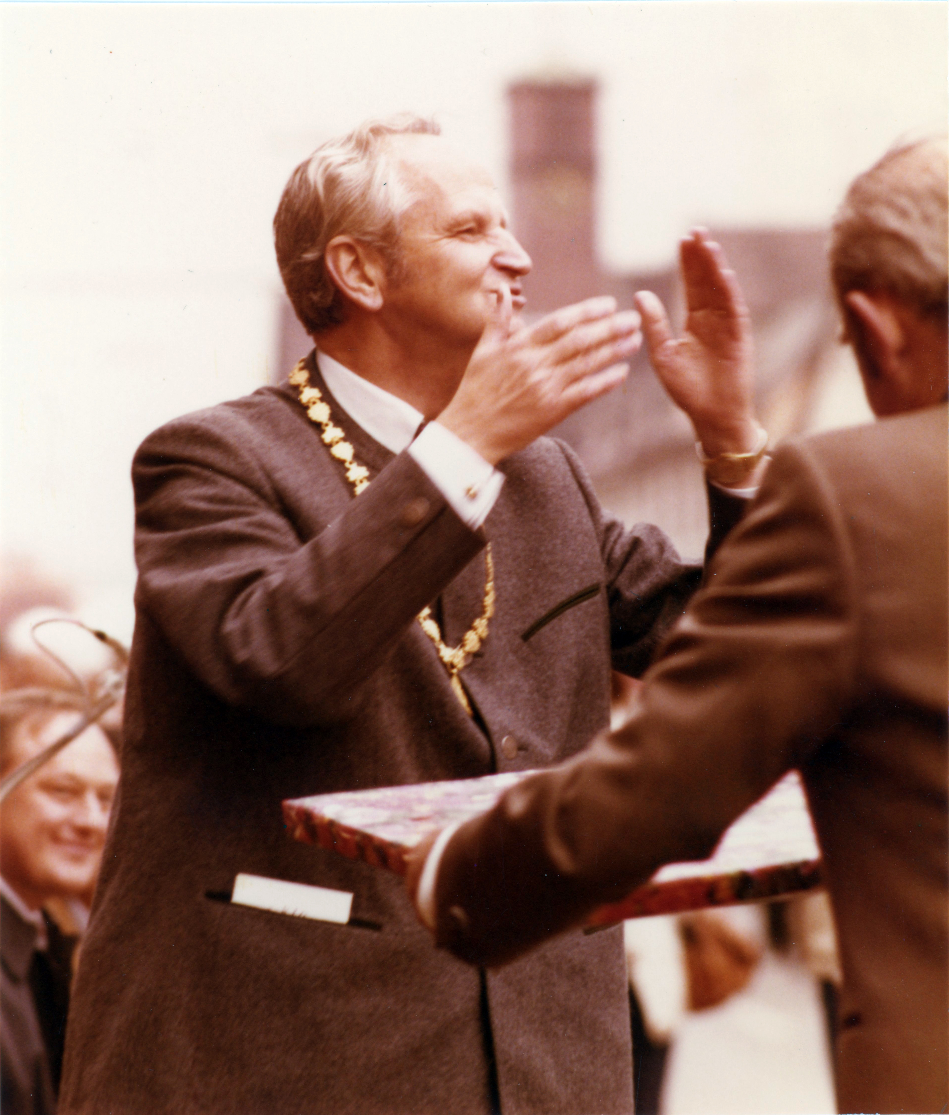 | Beschreibung | OB Kurt Scherzer am Bauernsonntag zur Michaeliskirchweih, Okt 1980 | ||