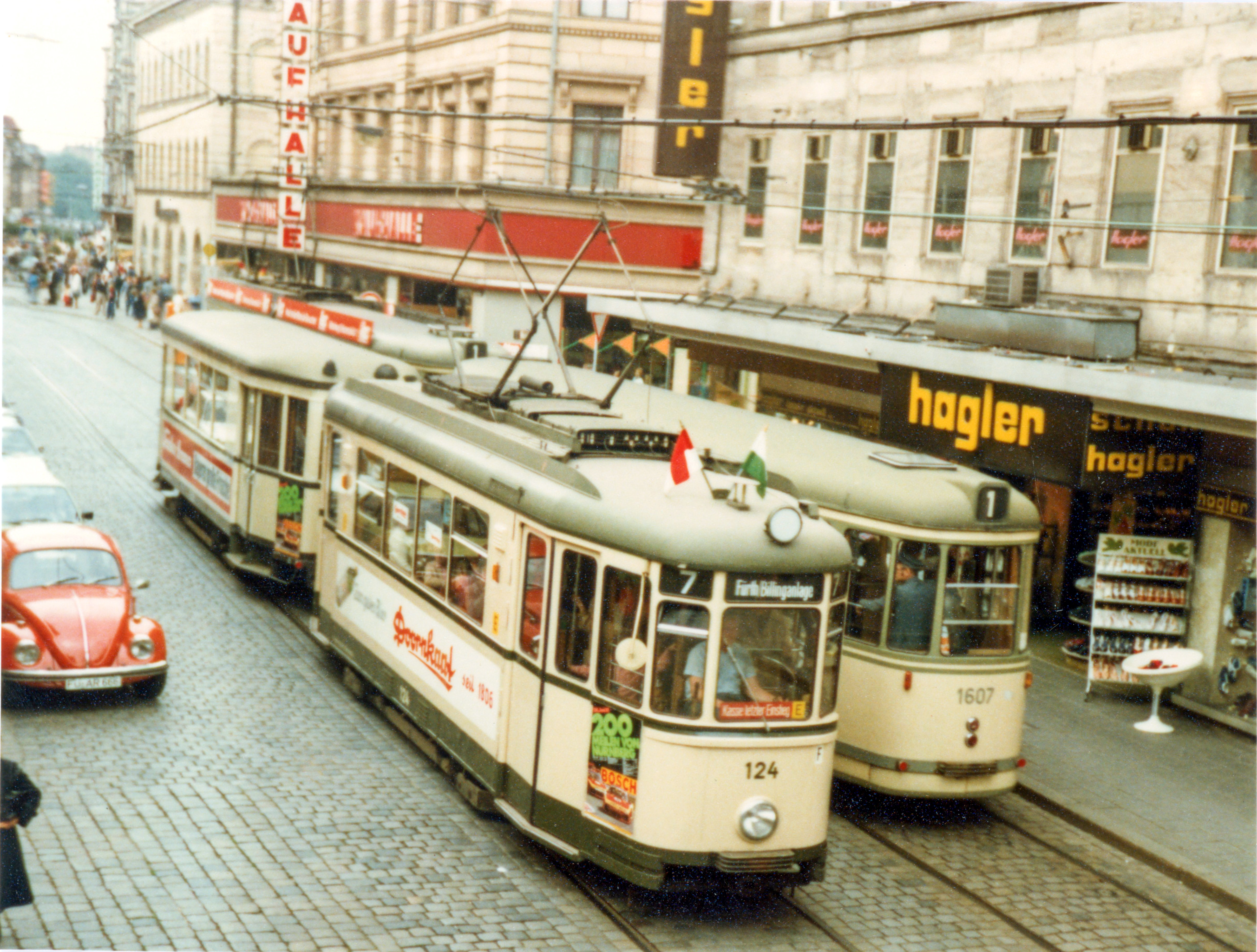 | Beschreibung | Letzte Fahrt der Straßenbahn in Fürth, 20. Juni 1981. Triebwagen 124 mit Beiwagen 1309 auf Linie 7 begegnet auf Höhe Blumenstr. einem Zug der Linie 1 | ||